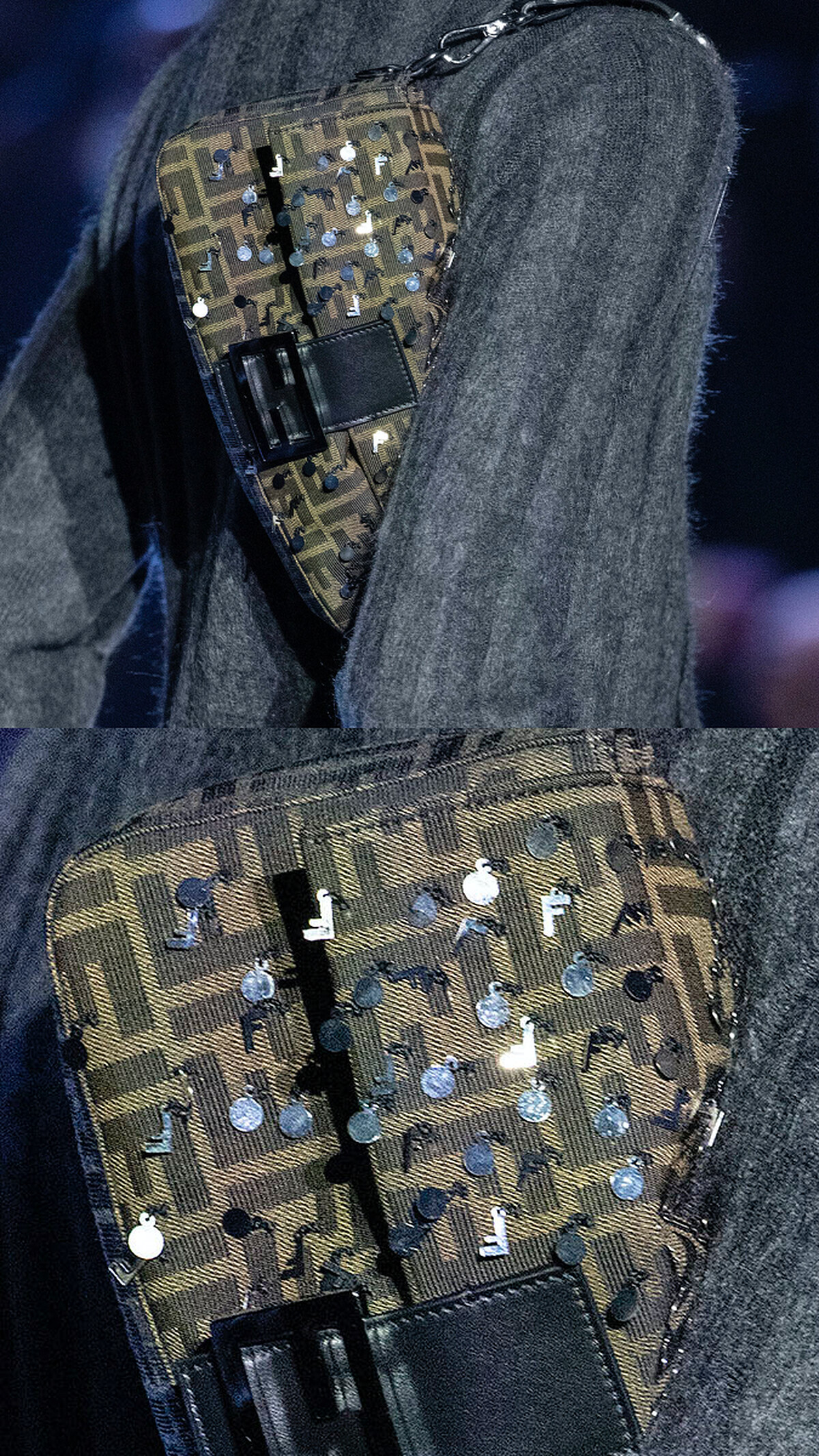 Baguette之於Fendi的重要性應該無需再贅述,時髦的腋下包不再是女生專利!乍看以為男裝秀上的這一顆Baguette是以刷破處理、老花布下襯另一款丹寧面料;放大一看才發現原來是一點一點的亮片,並將F字也精巧地融入其中。