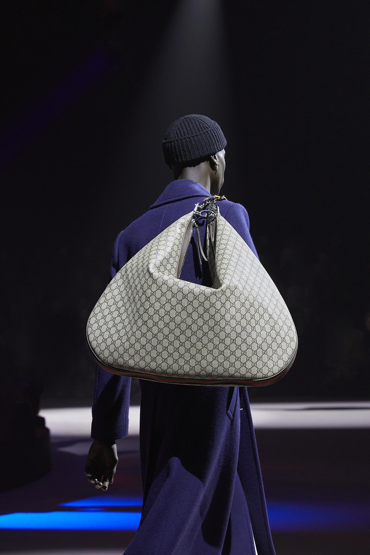 挪用女包設計的還有剛問世的Gucci Attache,以開合兩個截然不同的造型深植人心,來到男裝秀直接給它照上放大燈、巨型模樣宛如兩天一夜用的旅行袋。