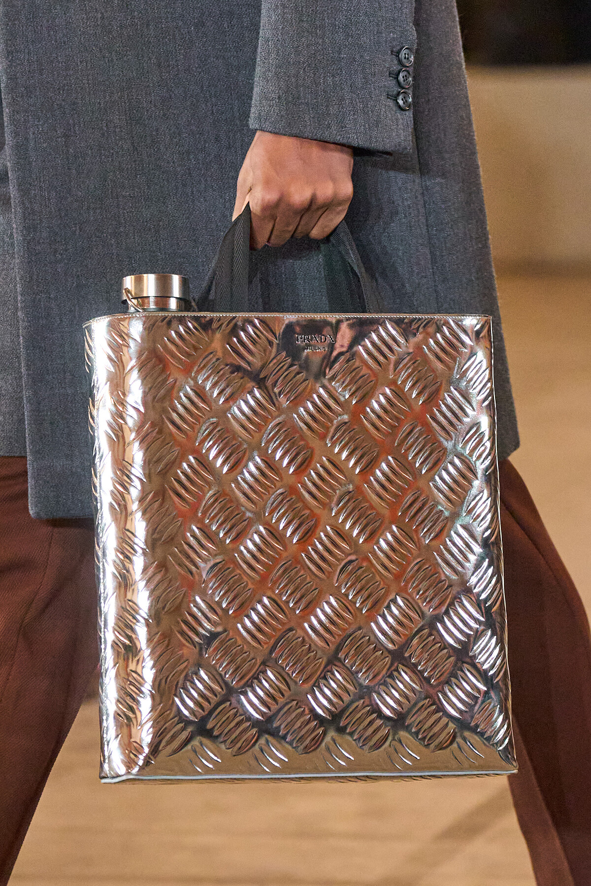 自Raf Simon上任以來,Prada時以洗鍊設計打動極簡控的心,男裝此回吸睛包款一大一小,前者為實用的長方托特包,特別的是皮革上的金屬壓紋,藉由因屬的「硬」與皮革的「軟」呈現出衝突感。