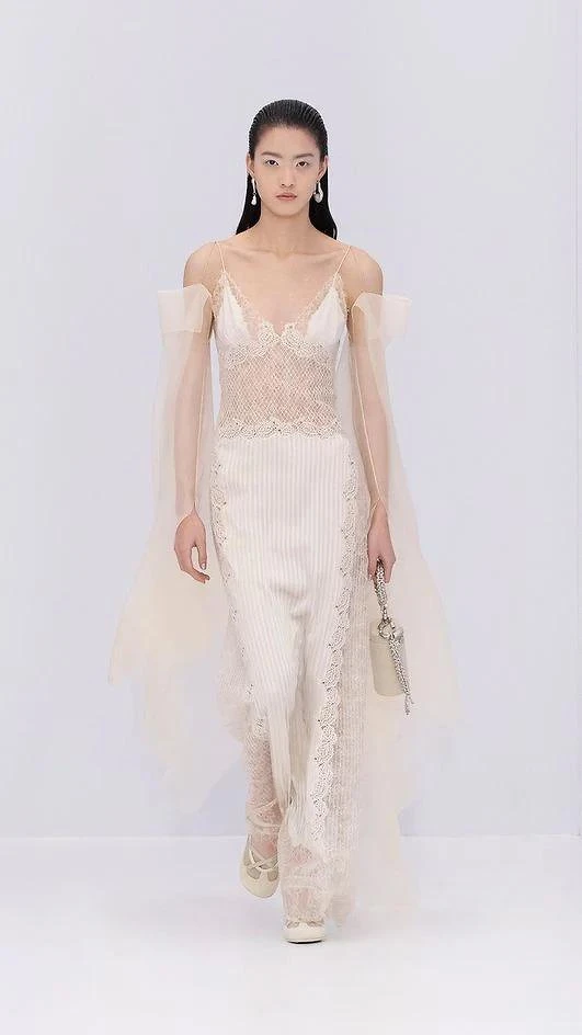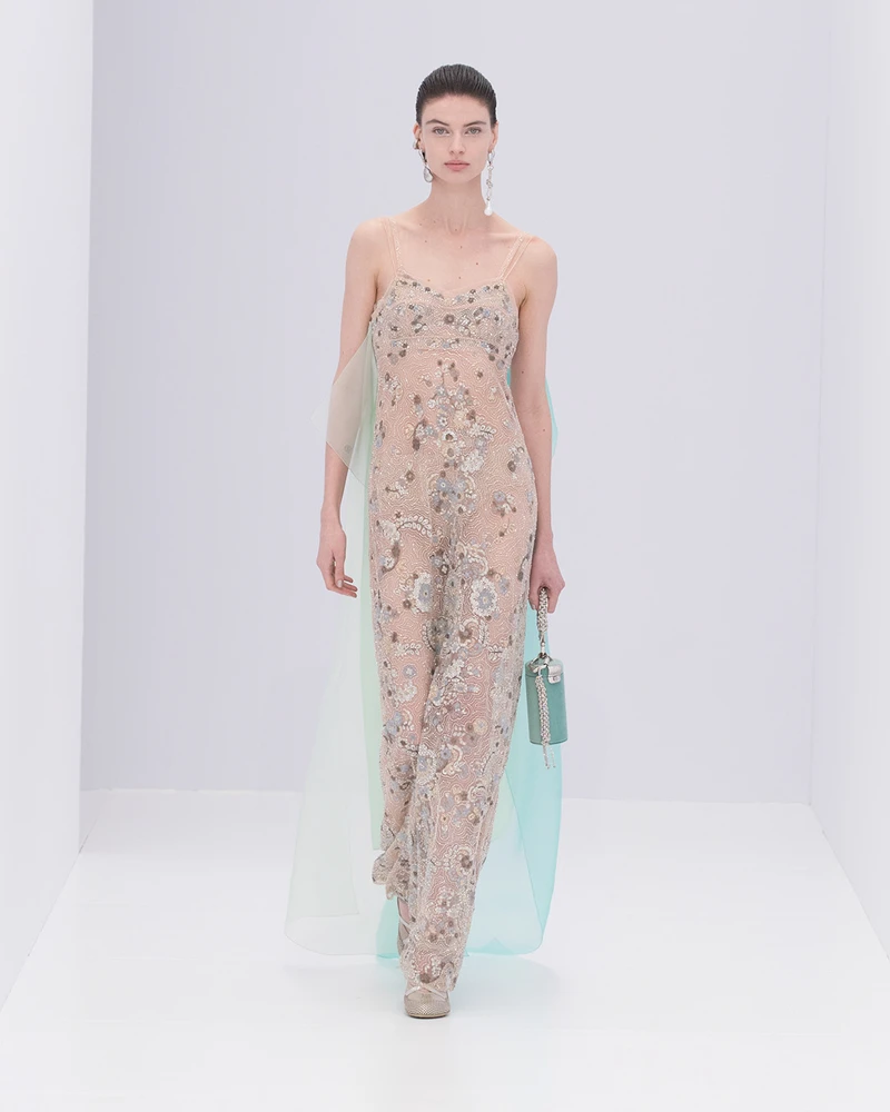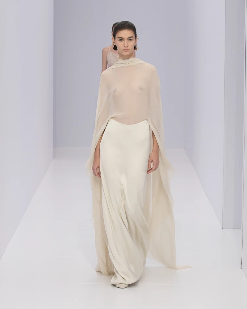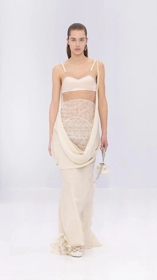 也因為從輕盈的視角出發,本季Kim Jones也嘗試將大量的薄紗變成禮服的主角,讓身形完整地畢露,禮服若是只是單放在人形台上好像缺了點什麼,有了身軀穿上之後才變得完整。