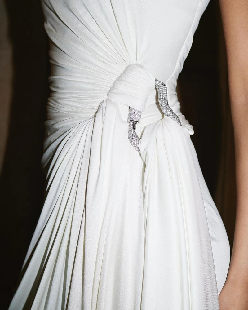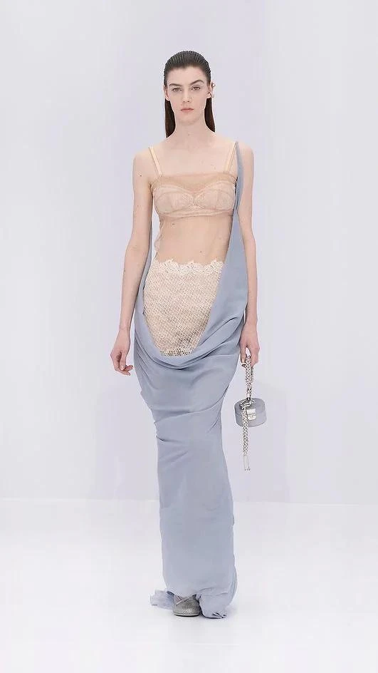 轉瞬間,2023SS Haute Couture是Kim Jones在Fendi的第五場高訂大秀了。Kim Jones開宗明義地說:「高級訂製服總是給人家穩重、盛大的感覺,我想呈現時下推崇的輕盈感,優雅依舊但是年輕一些。」就這樣,Fendi 2023春夏大秀從女身貼身衣物的輕盈視角出發,參入了一些古羅馬服飾的掛袍設計、未來感的金屬蕾絲細節,藉由透視的布料讓身軀也成為完成訂製服的一部分。