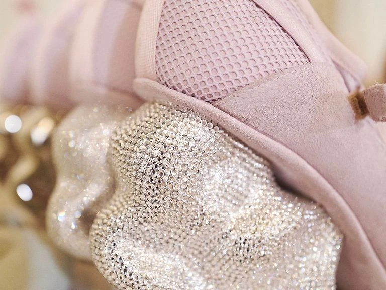 在仙氣飄飄的禮服下,Kim Jones另外還藏了一手!過往你我的記憶裡,禮服就該和高跟鞋搭在一塊,Kim Jones再把破這樣的既定印象,以運動感風格的鞋取代,亮點之處在於不規則狀的鞋跟,Kim Jones這是從攀岩牆上的石塊得來的靈感。