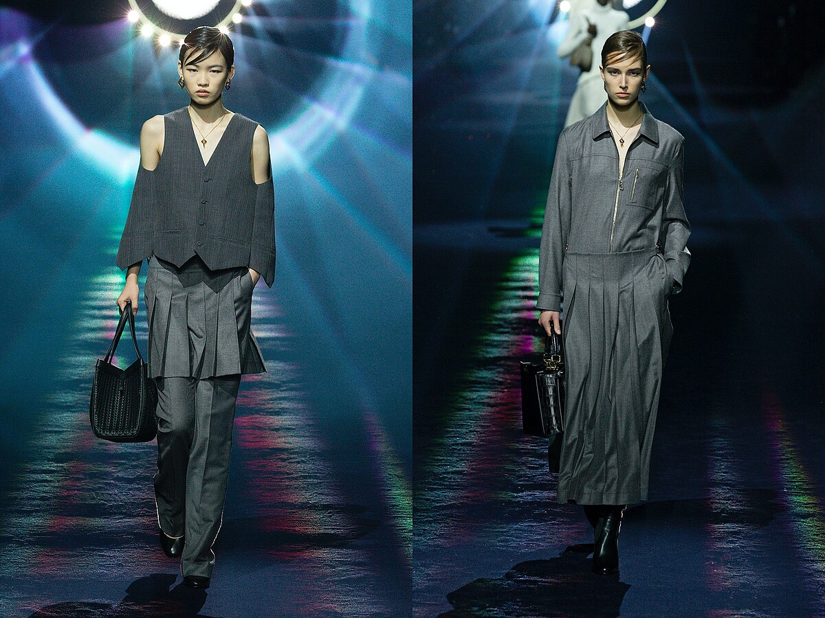 每回提及「中性穿搭」,好像就只有寬鬆、落肩的oversized選擇。熟稔男裝設計的Kim Jones,移植了男裝服飾中常用的設計元素以及硬挺面料,換成窈窕的女裝輪廓,像是露肩設計的西裝背心、變奏而來的工裝連身洋裝,不落俗套的「男版女用」,展現新中性美學觀。