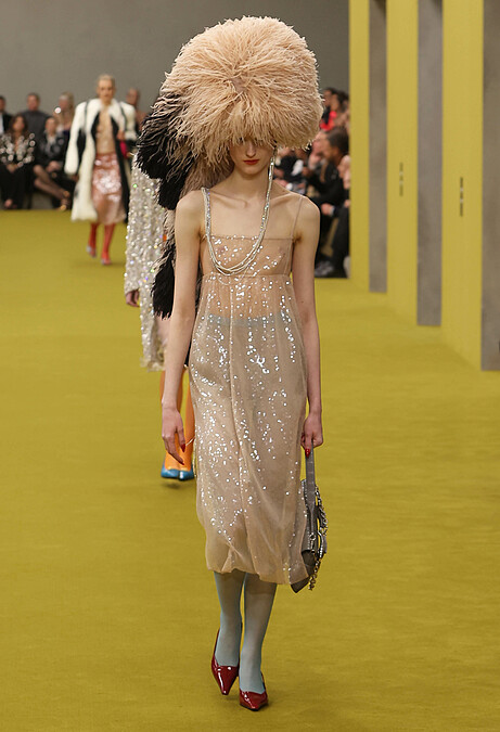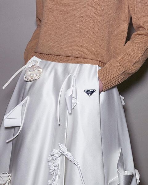 在過去幾季秀上,我們大概熟悉了Raf Simons的極簡之道,然而,在Prada 2023秋冬秀上,極簡二字更像是一種氣質、一股繚繞於空氣中的香氣。洗鍊的設計單品還是有,不過, Raf Simons與Miuccia Prada在本季更多一分浪漫,移植了婚紗常用的立體花卉裝飾,對於Raf Simons來說,婚紗也是制服的一種,只是他把它變成更為日常的模樣。