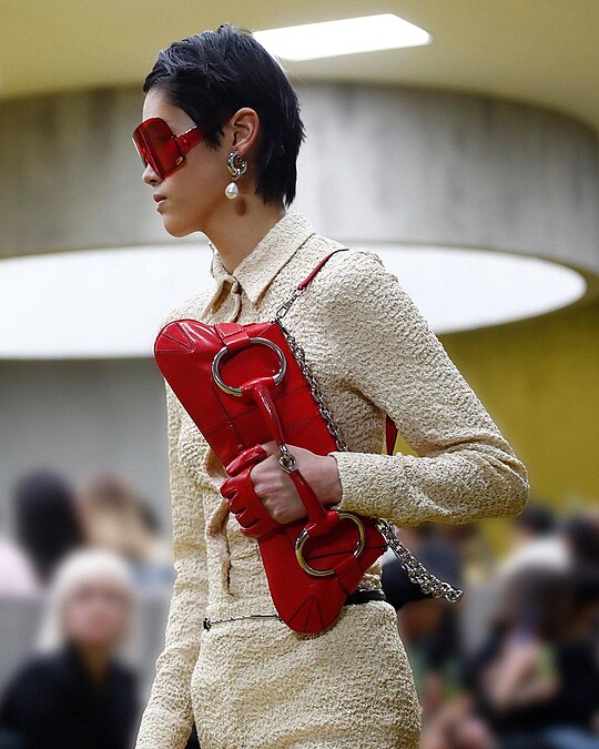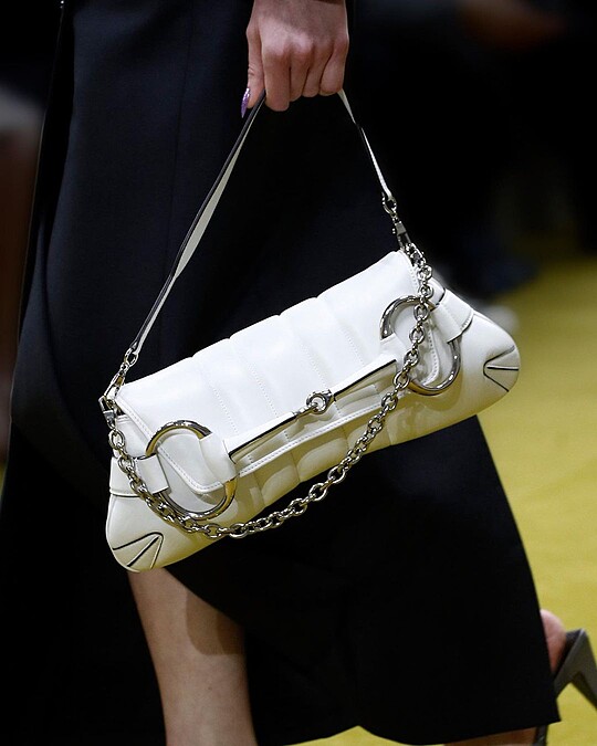 大家都在好奇,沒有Alessandro Michele的Gucci會是什麼樣子?謎底終於在2023秋冬系列揭曉!時下的Gucci像是從過去找尋未來方向,在2023秋冬之中仍能略見AM以及Tom Ford時期的影子,其討論度最高的手拿包Horsebit Chain Clutch就是一例——照了放大燈的馬銜鍊變成手拿包亮點,如是的設計最早於2004年就出現過,在本季以Y2K之姿再度回歸。