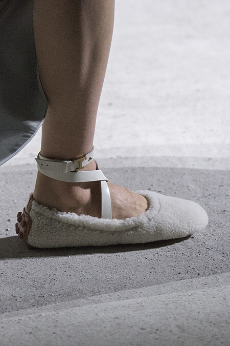 鞋履方面,再次看到豆豆鞋的變奏版出現,變成了芭蕾舞鞋的鞋型,把豆豆元素放大,以剪羊毛衣材質拼接皮革綁帶,為經典帶來新樣貌。