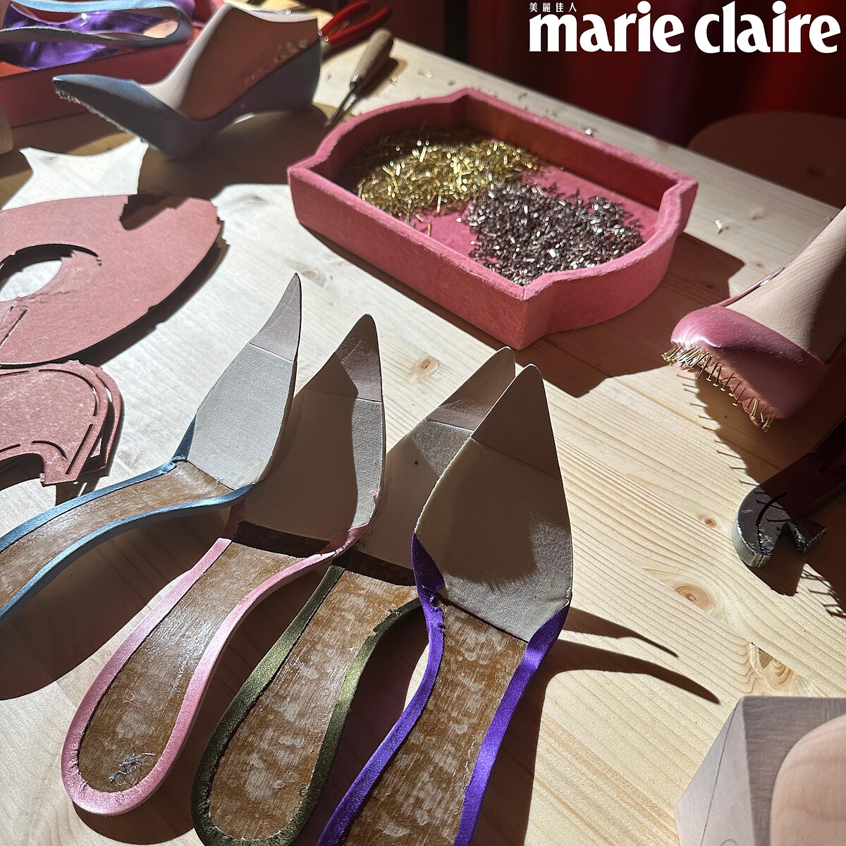 來到配件屋的最後一個房間,看到三位工匠分別忙著鞋子的鞋跟、方釦裝飾以及鞋楦加拉幫等不同細節,完成一雙鞋需要多位工匠的同心協力與默契,曠日又費時,就也不意外為什麼Roger Vivier一直能夠佔領精品鞋王地位。