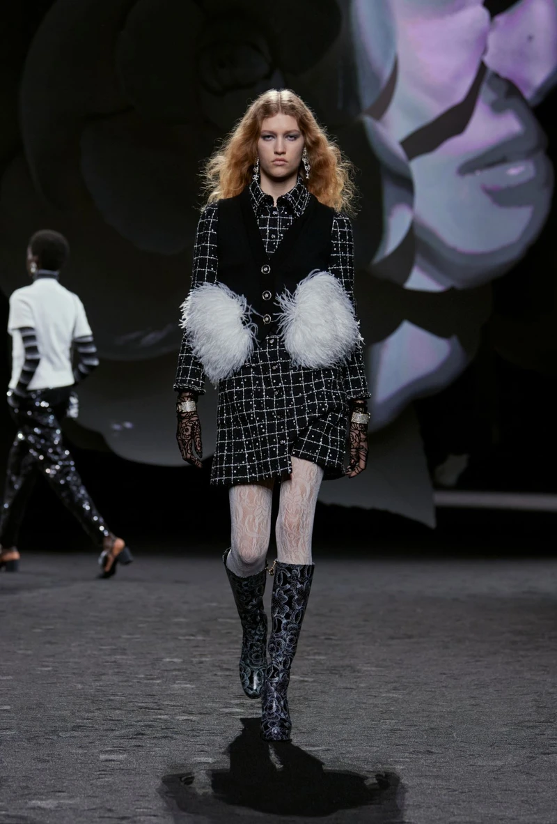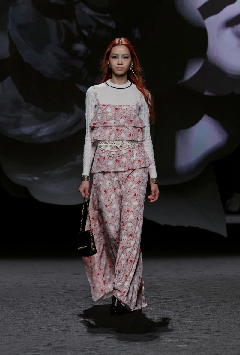 維吉妮·維婭(Virginie Viard)這一季以Chanel最具標誌性的山茶花為主題,在秀場建構了多件大型山茶花裝置,正場秀透過投影變換影像,襯上好聽的音樂,幻化出多變且多彩的浪漫氛圍。