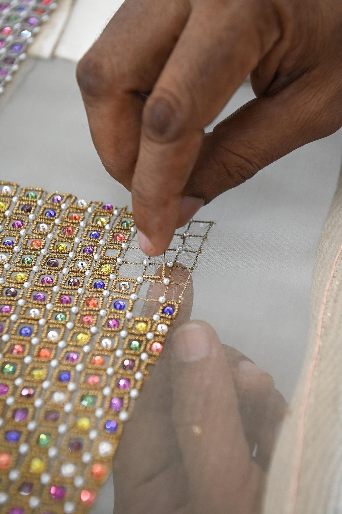 這場藝術交流的時裝饗宴中,有著多彩豐富的視覺體驗,濃厚的工藝精神,比如印度自古流傳至今的絲織工藝體現在罩衫、打褶裙與洋裝設計上。有趣的是,雖然保留濃厚的傳統底蘊,卻注入了令人耳目一新的現代風格,具有高實穿性的直筒褲襯上華麗珠片,金屬絲線勾勒出絕美 Zardozi 刺繡工藝,虹彩蕾絲點綴華服,為造型加入多元性與女性特質,幾何概念重新塑造印度傳統印象,設計師將傳統血脈保存,讓雙方文化與長久聯繫深深流淌在這場優雅雋永的時裝大秀上。
