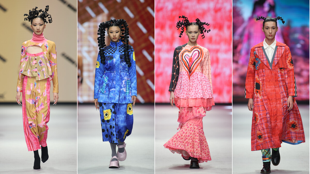 Claudia Wang設計師王子欣擅長將藝術美學及虛擬科技技術融入服裝設計中,試圖在文化、科技及製程整合中,探尋一條不同的永續時尚的實踐。Claudia Wang 2023秋冬大秀以「愛的文明」為主軸設計全新虛擬角色IP,講述多元包容、不分性別與體型的時尚概念議題,服裝輪廓以包容各身形的H line和I LINE款式為主軸,以模擬絨毛的印花及品牌經典格紋樣為基底,運用色彩搭配奠定柔軟卻不失堅毅的形象,再用圓點、手繪形式愛心、奇異造型花草元素等打造Y2K視覺,表達永不失去好奇的赤子之心。