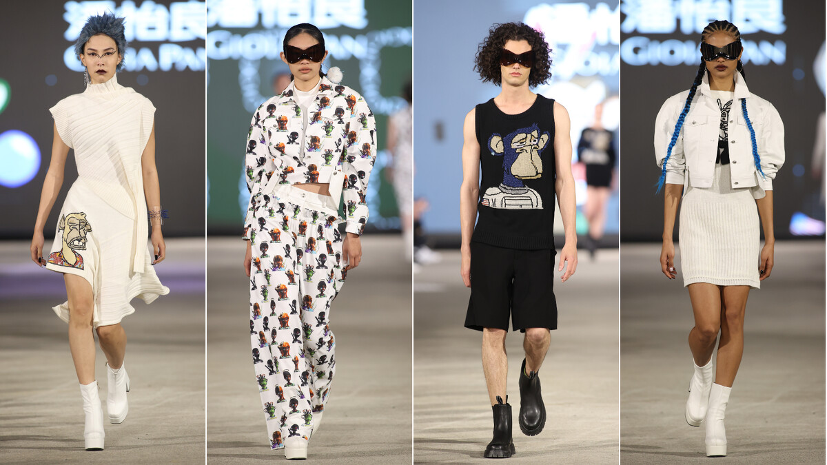 除了以「海洋之心」為創作主題,潘怡良GIOIA PAN 大秀亮點在於,結合全球知名兩大NFT IP「無聊猿」(BAYC)及「克隆人」(CLONE X),跳脫以往暗黑風格,以白色、藍色作為服裝色調,將跨界合作的圖像以針織技法與高端列印圖像布料,作為服裝設計的元素與設計,引領台灣時尚界走入多重宇宙的跨界呈現!呼應本季設計主題「海洋之心」,由任賢齊和名模王心恬領軍走秀,在海天一色的寬廣景致和北海岸最美的淡水夕陽霞光映照下,沉浸式要讓人感受多元呈現、夢幻聯動的時尚新美學。
