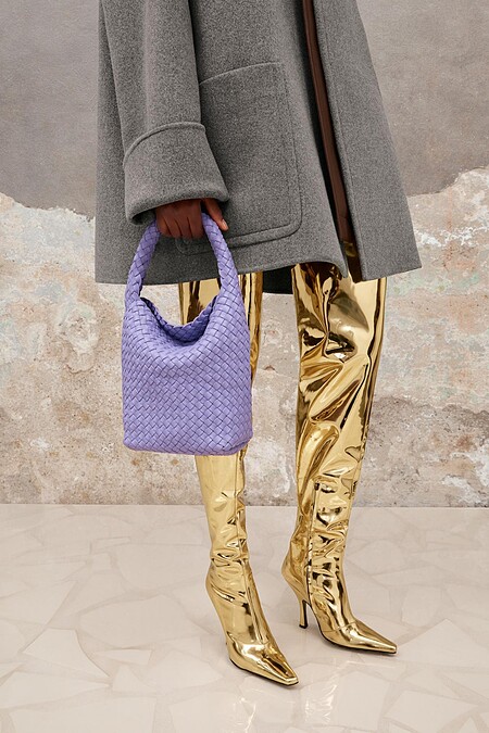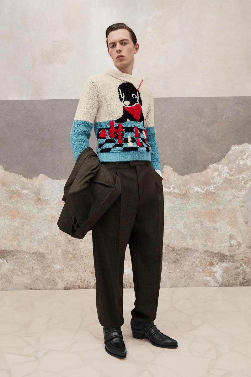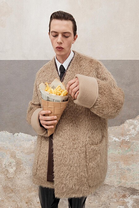 Bottega Veneta在本季之前,多給人一種熟稔、獨立的時髦感。2023早秋,Matthieu Blazy加入一點可愛的驚喜,像是把愛犬John John變成毛衣的印花圖樣;經典編織在本季推出一款三角錐狀的手拿包,形象片將其當作薯條手拿包,不失一款幽默又帶話題的造型配件。