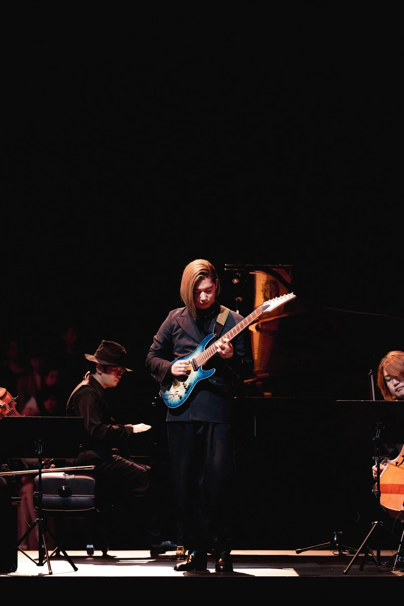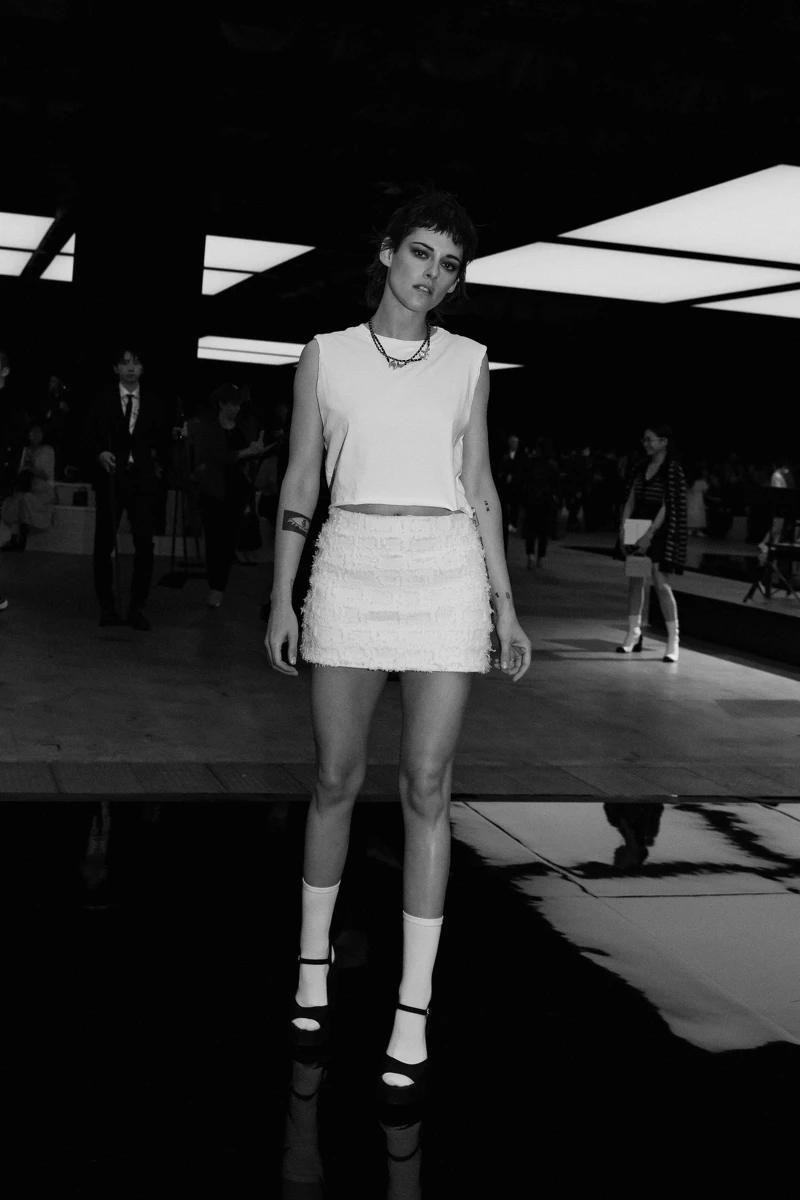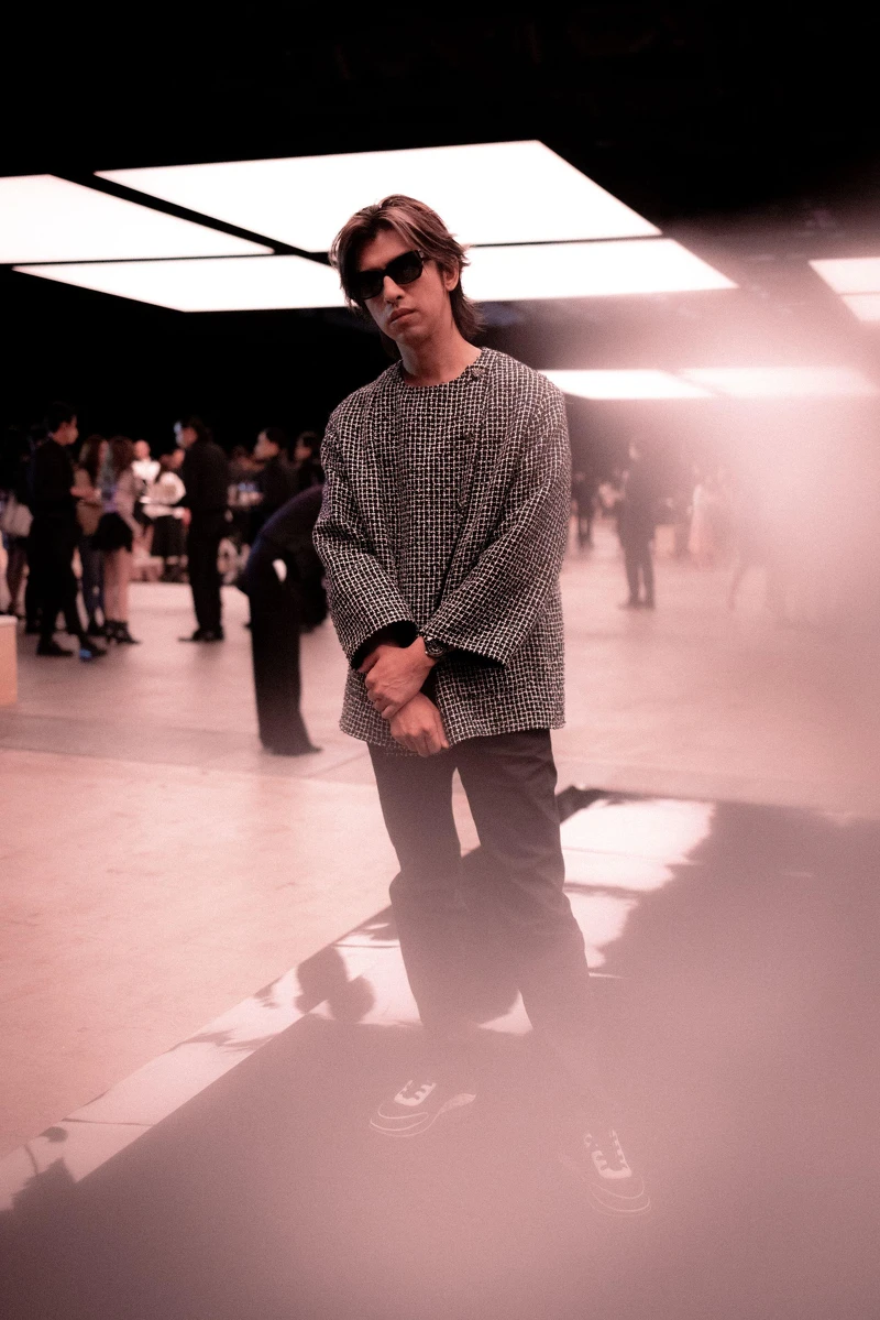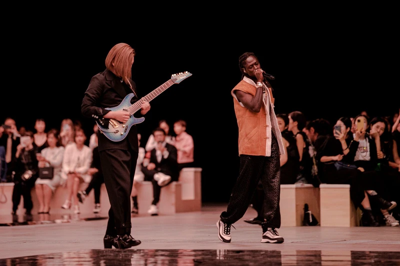 為大秀開場的是日本知名吉他藝術家 Ichika Nito,彈奏的是坂本龍一的名曲<Merry Christmas Mr. Lawrence>,當熟悉的音符在偌大的秀場響起時,所有喜愛「教授」的樂迷大概都紅了眼眶,這場秀無疑是香奈兒對這位當代最偉大的音樂家的致敬。接著,隨著Ichika Nito精彩的個人作品<The World Is Still Beautiful>登場的,是稍早在場外演出《Slow Show》的舞者,最後,有非洲嘻哈天王之稱的塞內加爾歌手Nix上場與Ichika Nito共同演出了一小段,揭開大秀序幕!