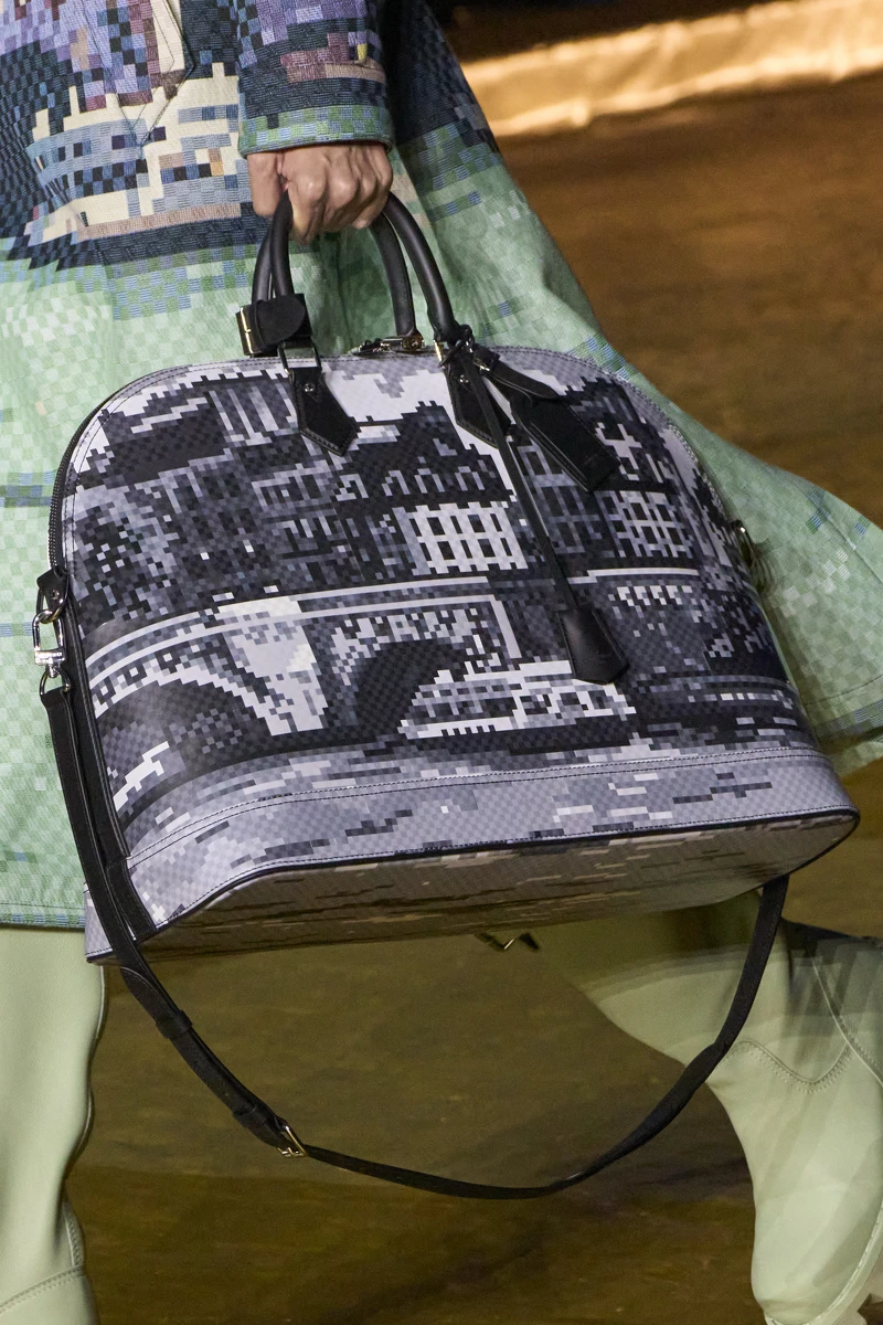 Louis Vuitton的經典Damier棋盤格紋讓菲董聯想到像素,便與藝術團隊ET Artist共同創造了像素化的Damier格紋,並成為本季的設計主軸,軍綠色調的迷彩格紋被運用在西裝、大衣、包包、硬箱、鞋款上……品項無所不包,一片綠油油的景象幾乎涵蓋了大秀的前半段,此外Damier格紋也以鮮豔色彩,或是丹寧的樣貌呈現;巴黎新橋的景色亦透過像素化出現於服裝與手袋上。