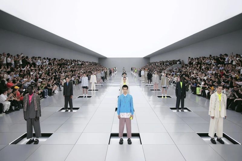 時裝秀場上,模特兒一般都是從場邊魚貫走出,Dior 2024春夏男裝秀上可說是讓模特兒們體驗到了巨星的出場方式,居然是站在升降梯上從地洞中冒出!51位模特兒們從地面升起的畫面實在太壯觀,現場驚呼連連,也立刻成為網路上的話題噱頭。