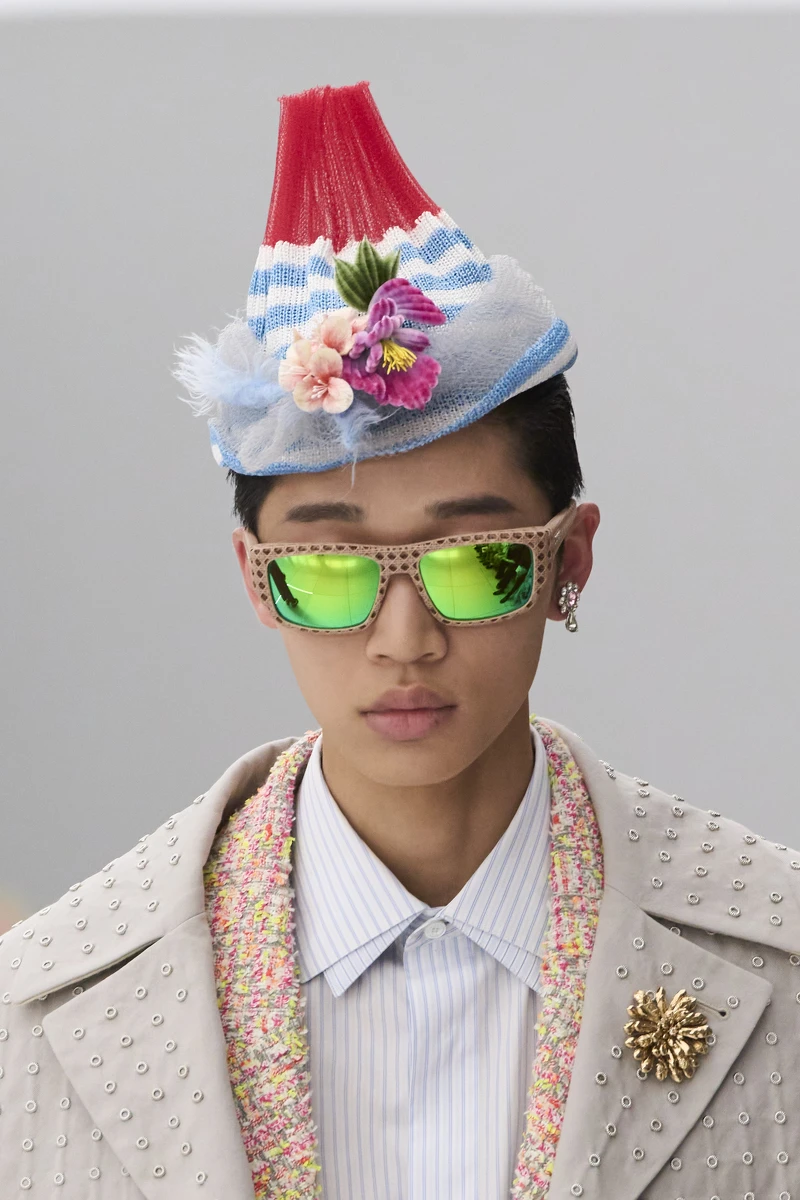 Kim Jones運用Yves Saint Laurent的中性氣質剪裁作為本季的骨幹,因此可以看到諸多明顯的女裝形象,連結男裝與女裝密不可分的關係。源自1947年首場時裝秀上藤編座椅的Cannage籐格紋,是Dior的靈魂標誌,則在這一季用大量毛呢、緹花的方式呈現於服裝配件上,更用亮眼的粉色、藍色、黃色等溫暖的色調,凸顯其柔軟的質地。加入Gianfranco Ferré的精緻刺繡、Marc Bohan對服飾特殊紋理質地的要求,Kim Jones將本系列打造成一座「花樣男子(hommes fleurs)」的機械花園,種滿了每個創意總監時期最耀眼的符碼。