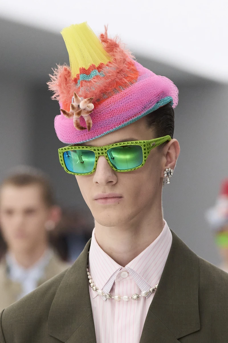Dior製帽大師Stephen Jones在本季創作一系列象徵自由的無邊便帽(Liberty Cap),由鮮豔俏皮的顏色、圖紋和特殊毛料材質碰撞組合而成,為眾多造型都增加童趣亮點,並以源自中國唐代的天鵝絨花取代帽章,彰顯工藝,是不是超可愛?