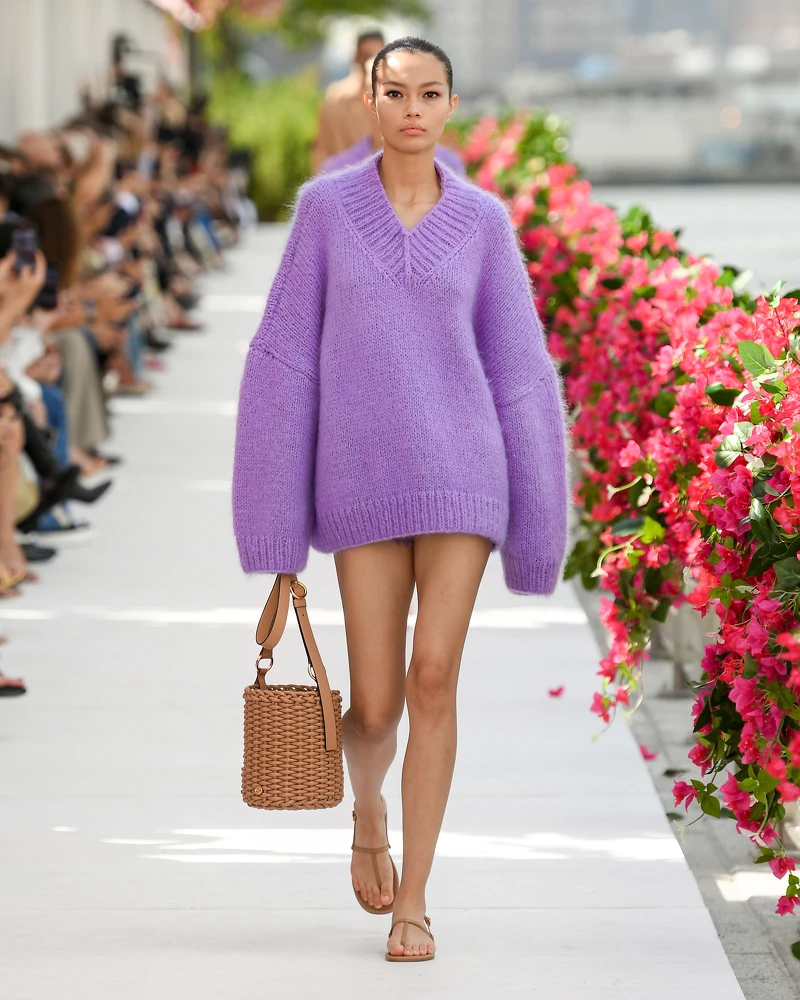 在一片仙氣的白色、裸色之中,一套薰衣草紫色的落肩毛衣特別讓人印象深刻!寬鬆的oversized版性,慵懶之中又有點性感的下半身失蹤造型,其實是向Michael Kors先生的母親致敬,在70年代早期,這樣的打扮對於當時的風氣來說顯得「前衛」,但是Michael Kors先生的母親覺得這樣穿很舒服,有什麼不可以?也回扣到本季渡假主題所想要的舒適、愜意感。