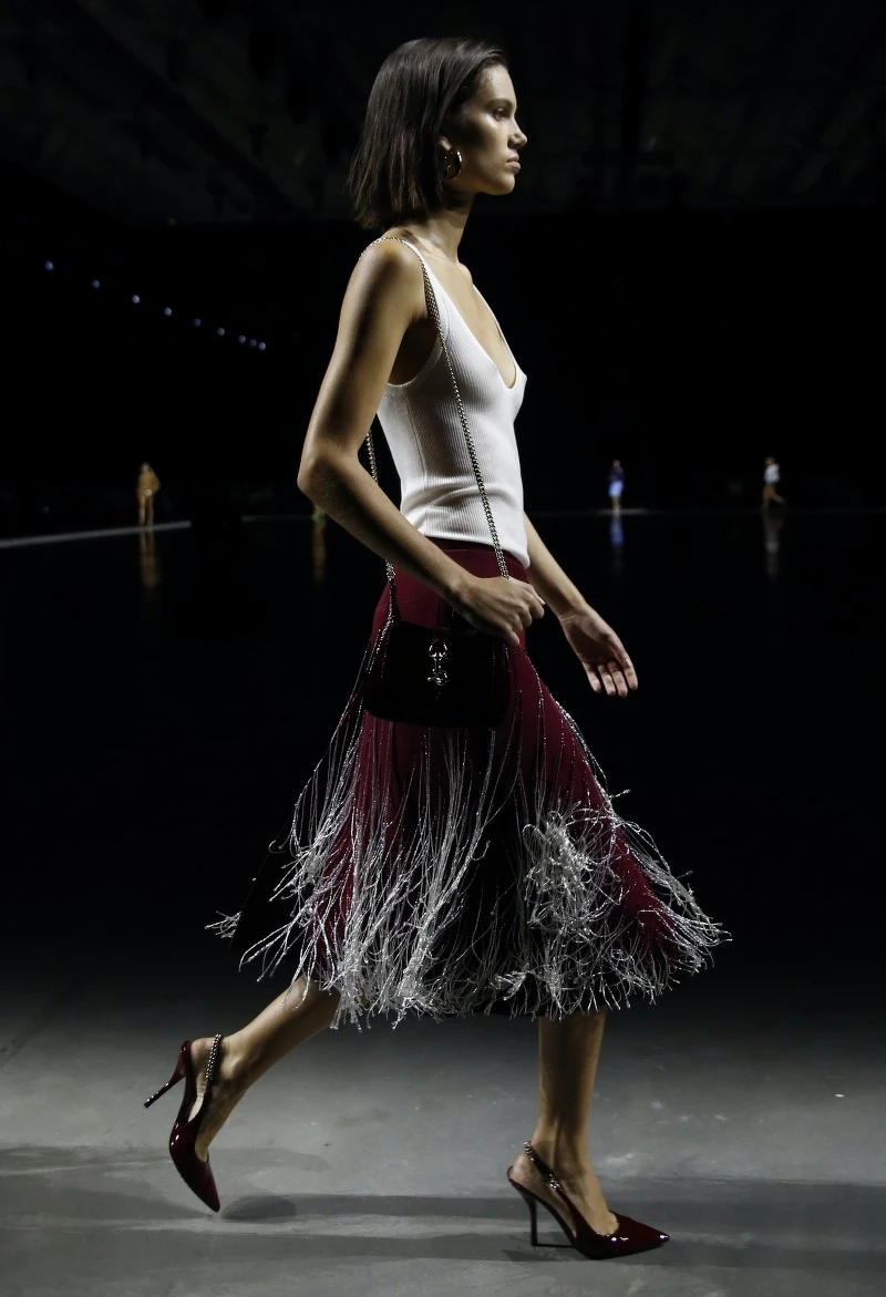 在《GUCCI ANCORA》的秀場上可以看到Sabato捨去了以往高調浮誇的印花風格,而是以俐落的剪裁與服裝輪廓展現他的設計底蘊,更因為本身鍾情於大衣,Sabato也直接以一套及踝的西裝大衣搭配短褲、白色上衣造型為自己的首秀開場,不言而喻的傳遞出GUCCI將回歸品牌經典DNA,一系列緊、窄、短的褲裝、裙裝與流蘇也展現了他對女性的所有想像。