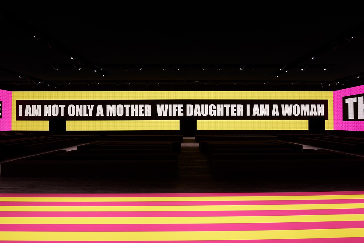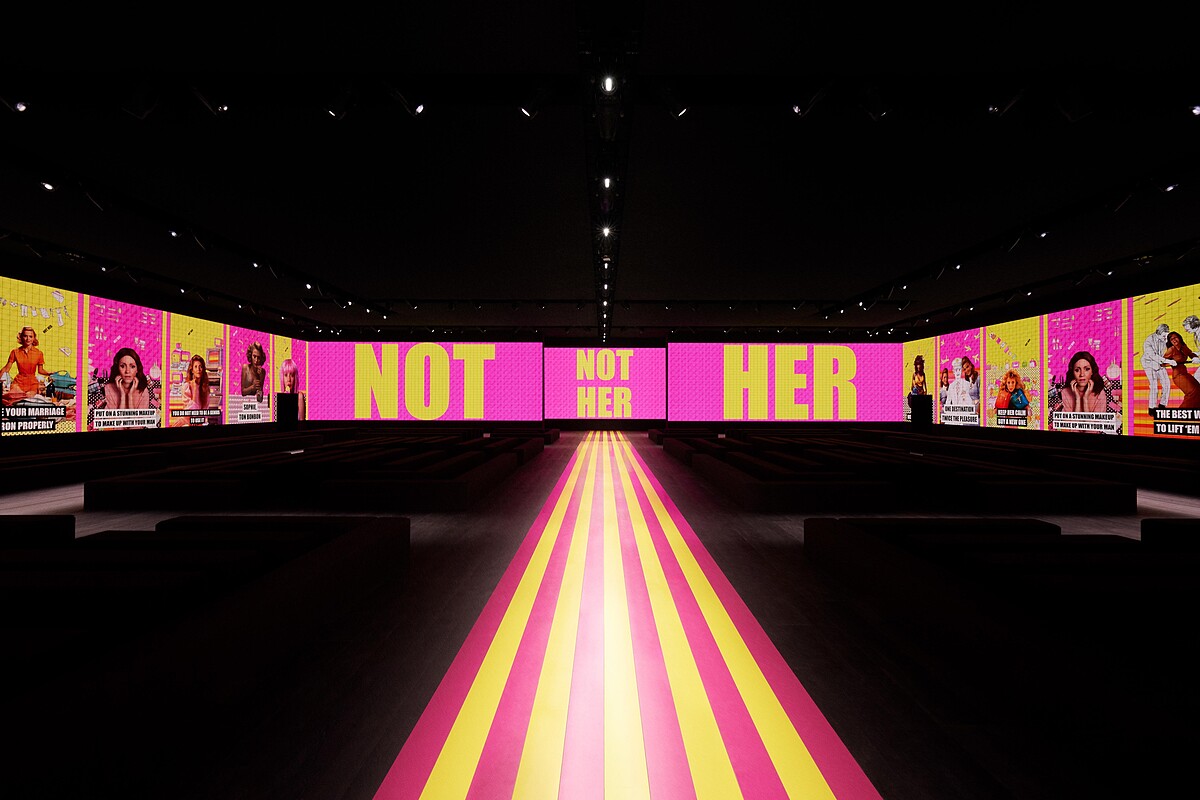 秀場是本次系列的一大看點,「It’s not her, she’s no longer all that 」作為系列精神標語,藝術家Elena Bellantoni將「NOT HER」的藝術作品概念融入會場,為全世界數位同步觀秀以及現場嘉賓們帶來一場前所未見的沉浸式體驗!探討關於女性束縛以及框架下的抗拒與拉扯,如同裝置藝術般,秀場牆面上彷彿機械翻頁的裝置以普普風呈現,藉由反骨文字與圖像打破刻板框架,呼應系列核心精神。