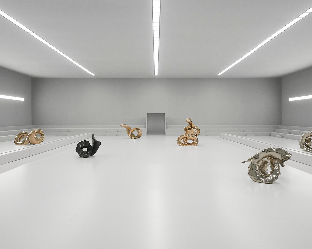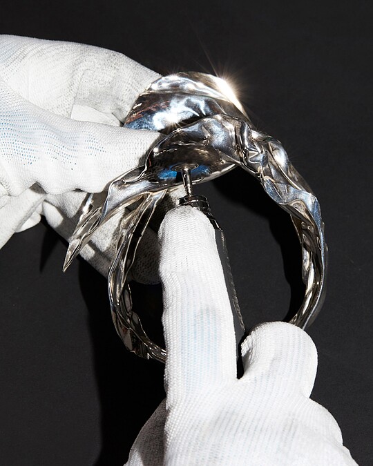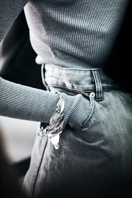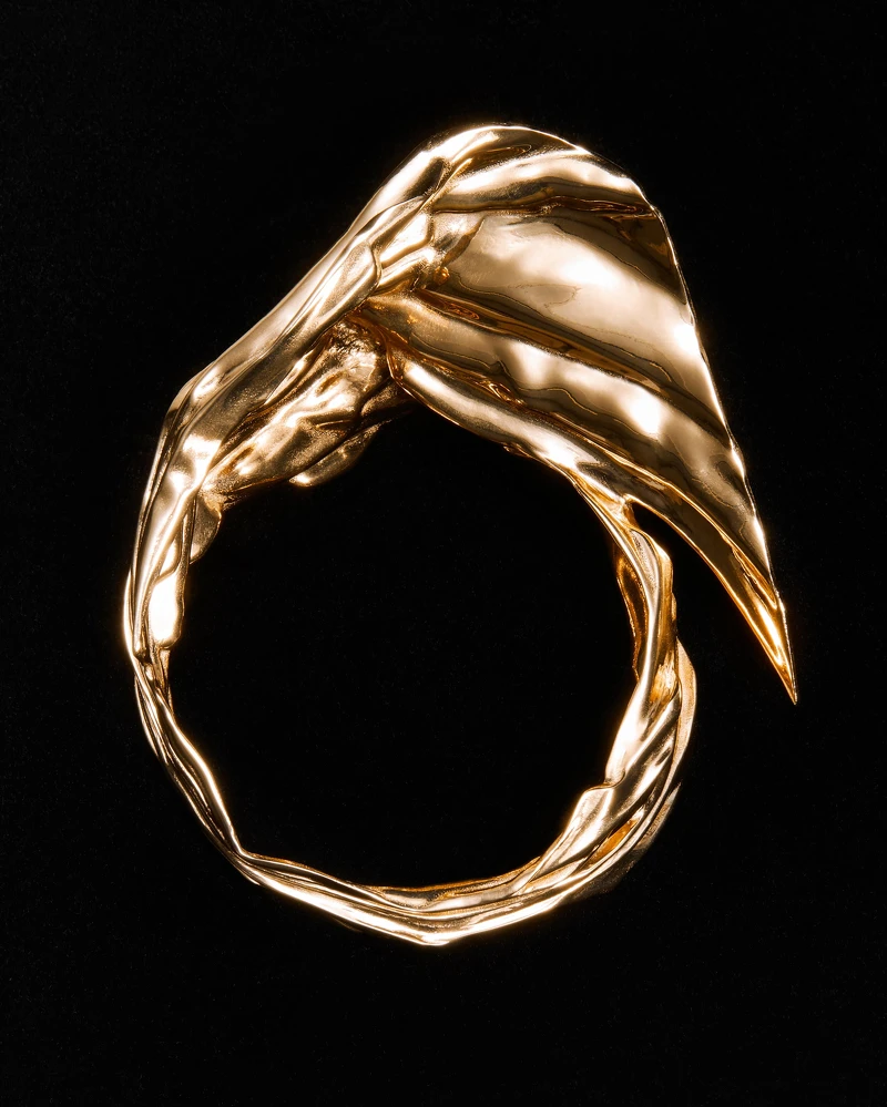而本次也找來了藝術家 Lynda Benglis 合作,藉由其擅長的黏土雕塑,設計出變形款戒指、耳環及項鍊等飾品,從擠壓到打結,秀場中擺放的六件巨型青銅雕塑,這些雕塑來自其《ElephantNecklace》黏土雕塑系列,光線能根據雕塑表面的拋光青銅及啞黑色銅鏽材質映射,展現出令人驚豔的視覺效果。