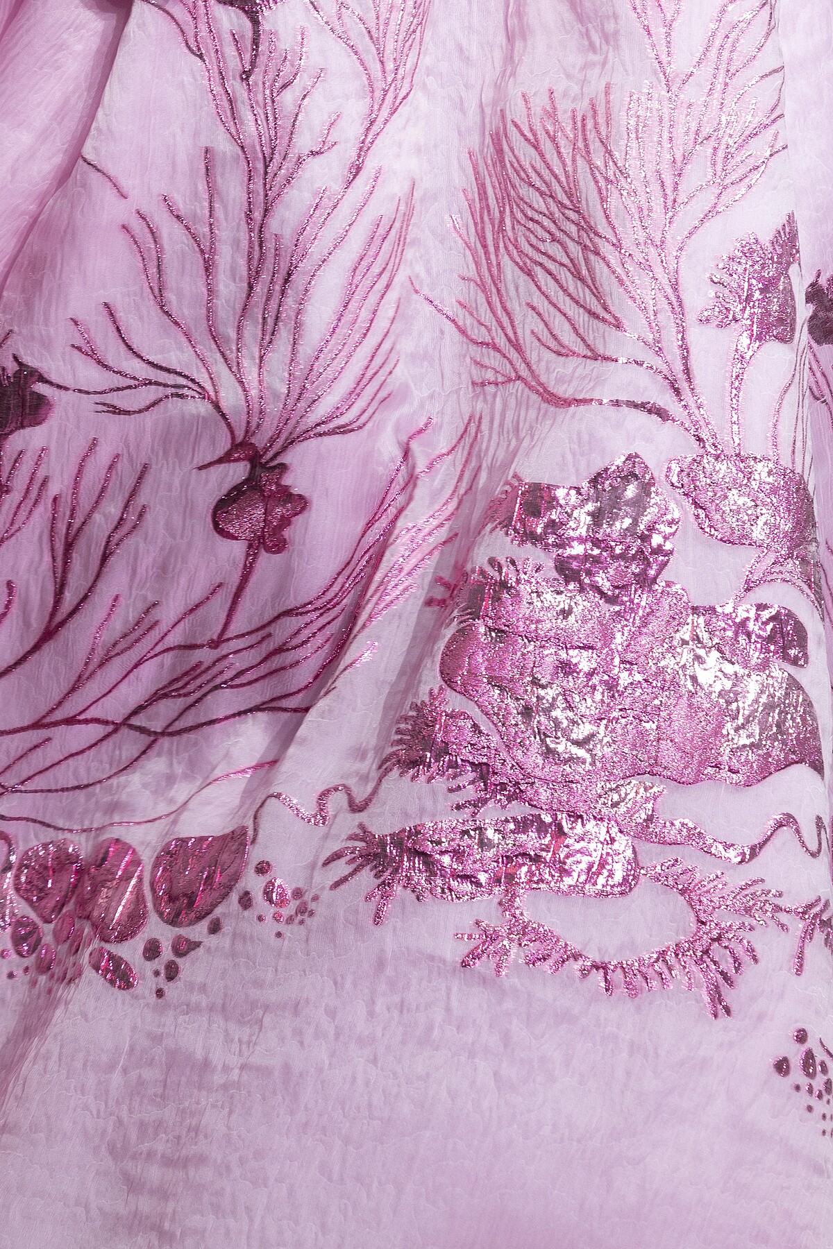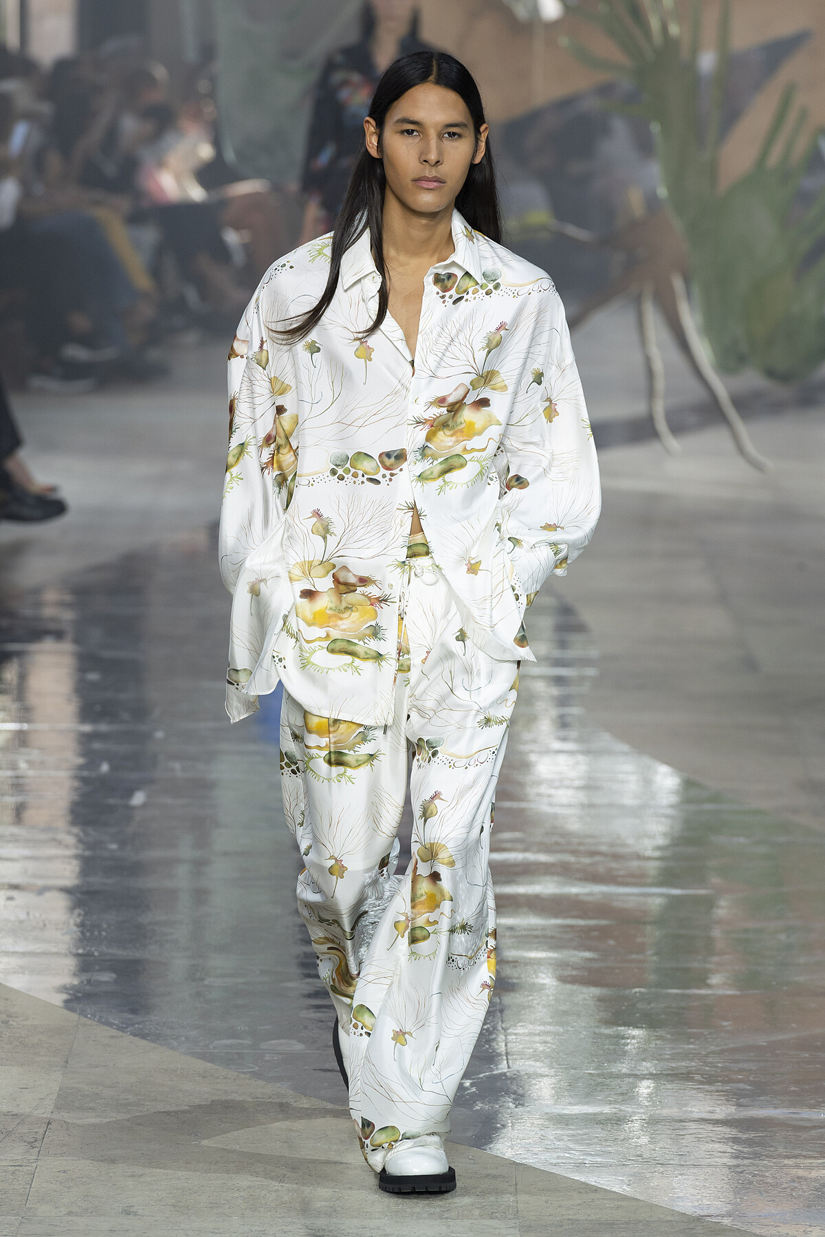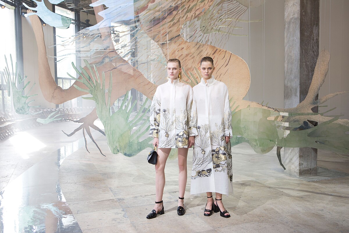 此次的秀場彷彿一條蜿蜒海流,綿延不絕卻又蘊含無限能量,在深具層次的秀場中,觀秀者能夠自在地沉浸在視覺與聽覺的饗宴之中,獨特的工藝製作手法讓秀場宛如真實海底般令人著迷。