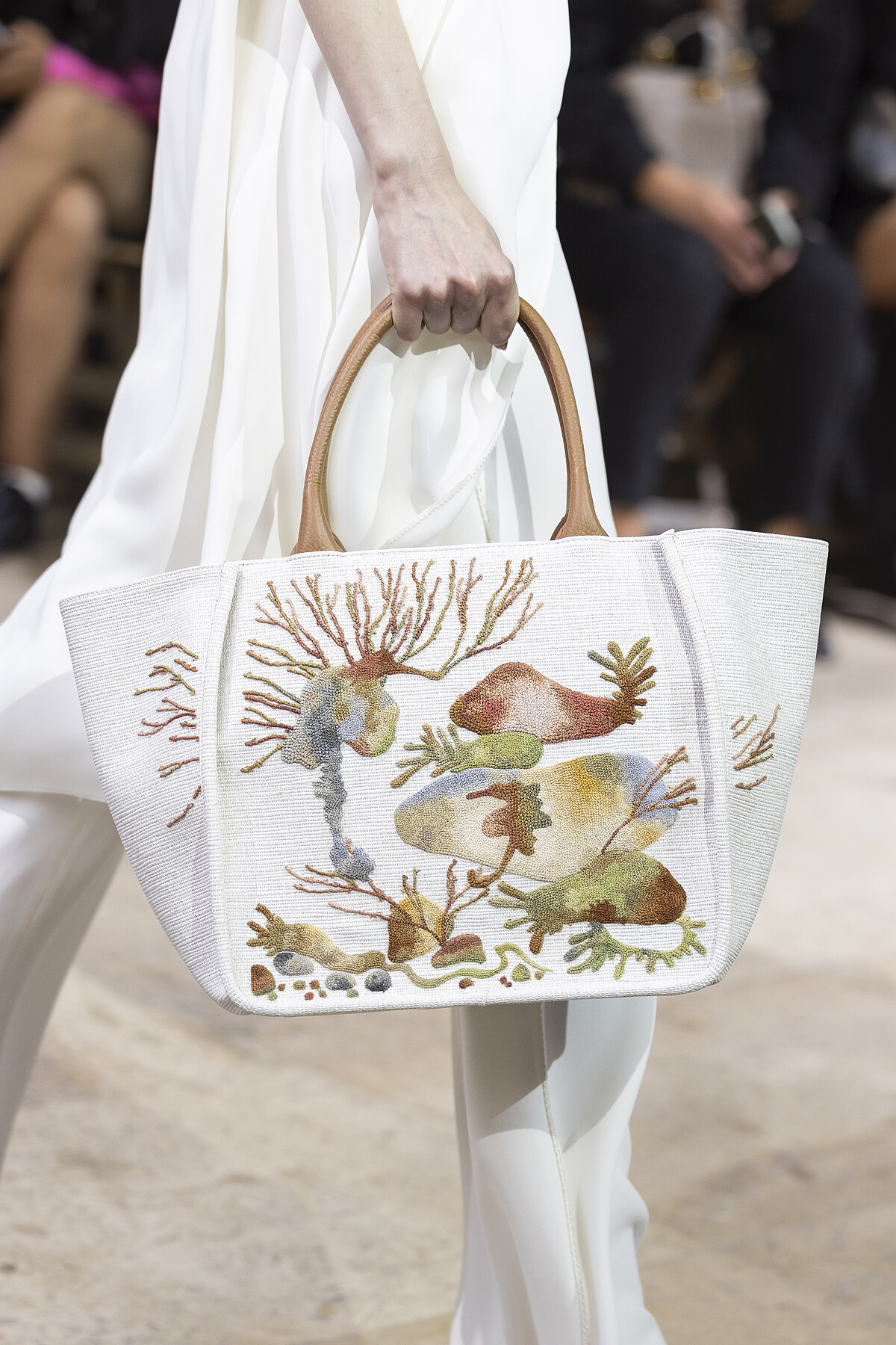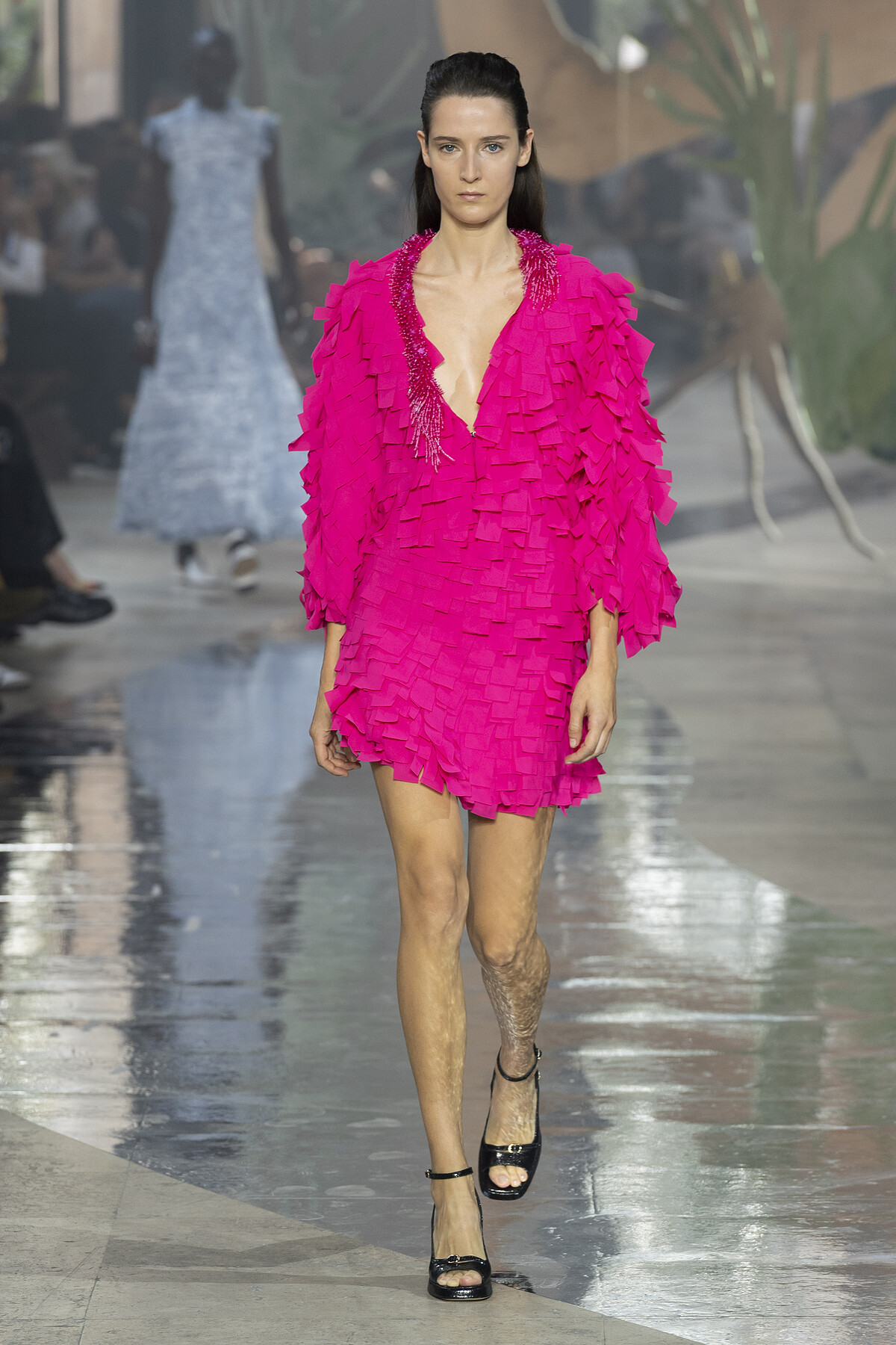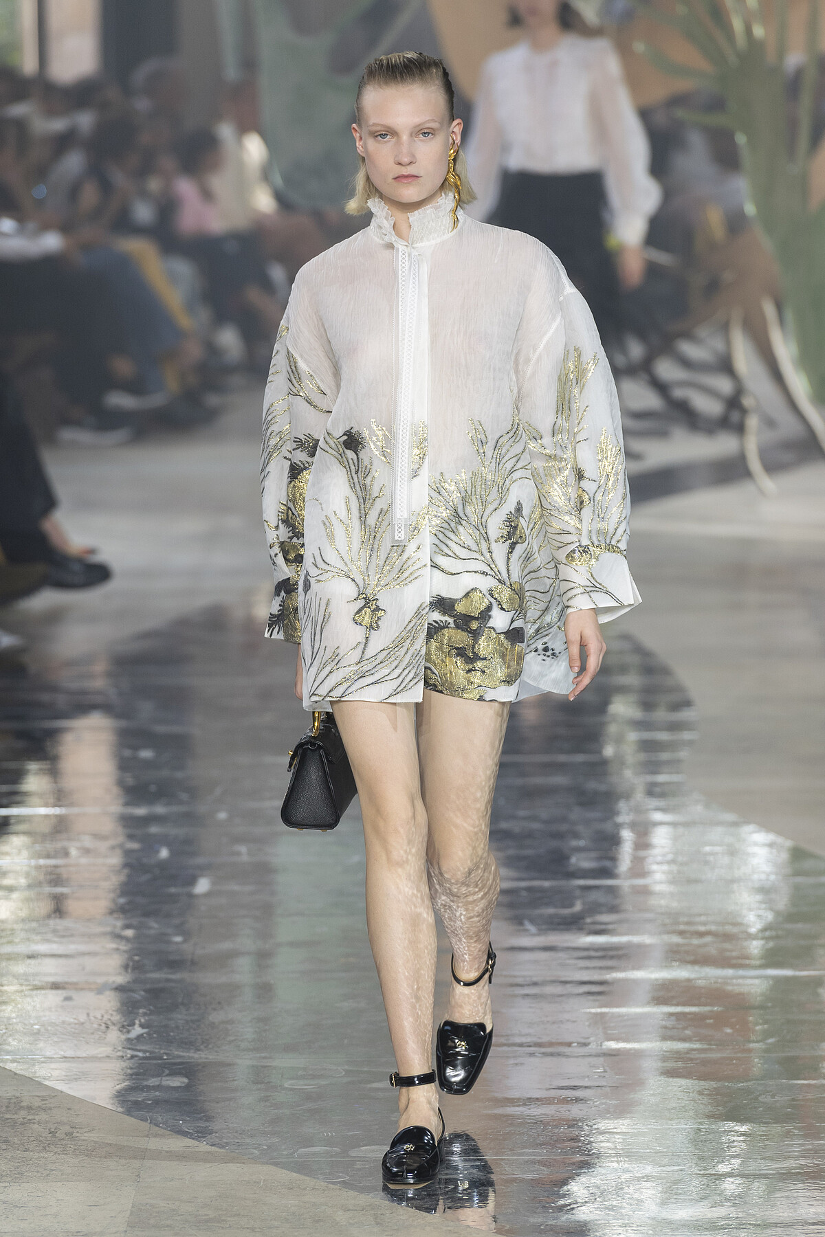 位於巴黎東京宮的秀場宛如一道蜿蜒海流,虛實交錯,揉合東方之美,斑駁感的抽絲丹寧裝、亞麻穆勒鞋及抽繩束口包等單品為系列造型帶來摩登氣息。本季色調更考據青花雲龍瓷器的色調,胭脂桃與青瓷藍勾勒出傳統與當代的連結,刺繡、印花與金屬提花更彰顯著對於工藝製作的精湛要求,在優雅的東方詩意中更具力道。