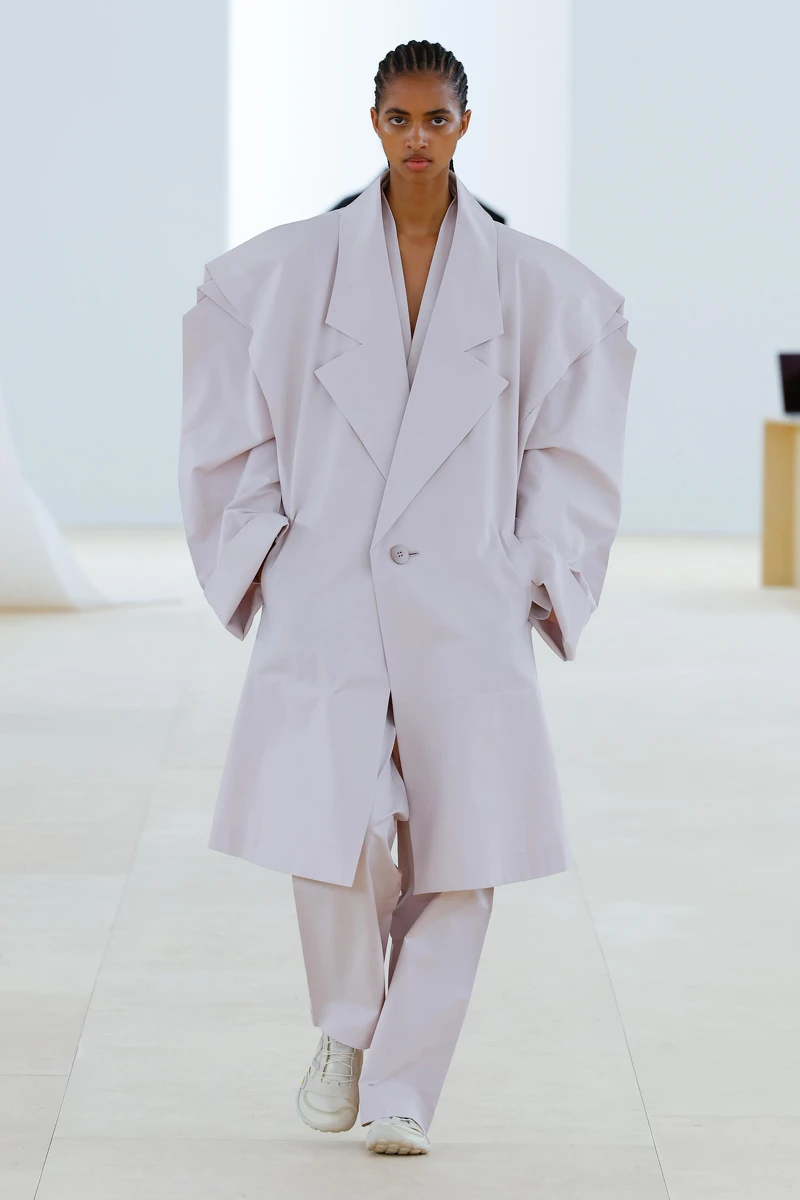 在虛實之間,既抽象卻又具現地讓人著迷,ISSEY MIYAKE 標誌性的縐褶元素穿梭其中,「誇張的輪廓」為本次大秀一大看點,具有空氣感的輪廓讓穿著者擁有最佳舒適度,設計師的獨特視角和「一塊布」的核心美感喚起了對三宅一生的懷念,對面料的極致追求,賦予了系列無限新意與未來!