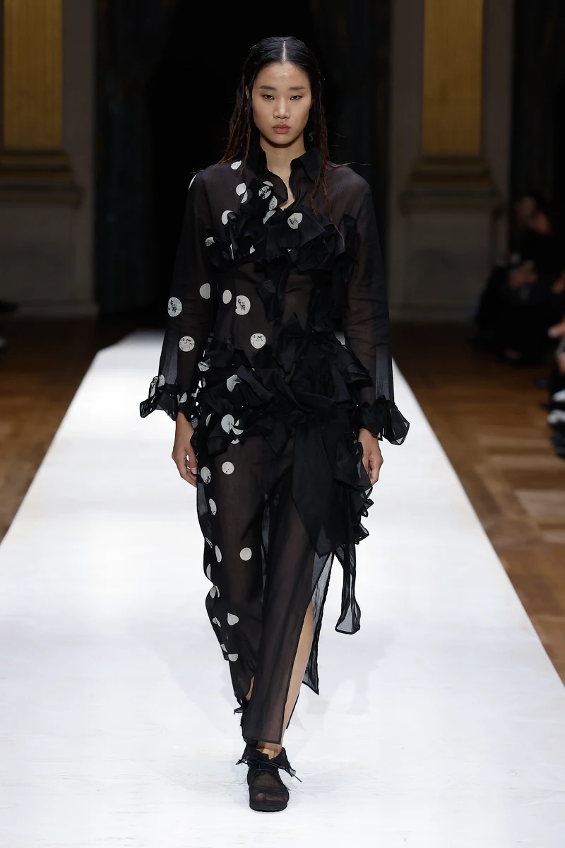 解構式的細節與經典的 「黑」樹立了山本耀司大師級裁縫的標誌性樣貌。 Model 們身著如同花朵綻放的荷葉邊裙裝、透明薄紗及中性俐落的正裝造型,隨著節奏漫步,將經典的解構細節重組為時尚迷再度帶來了深刻感動。