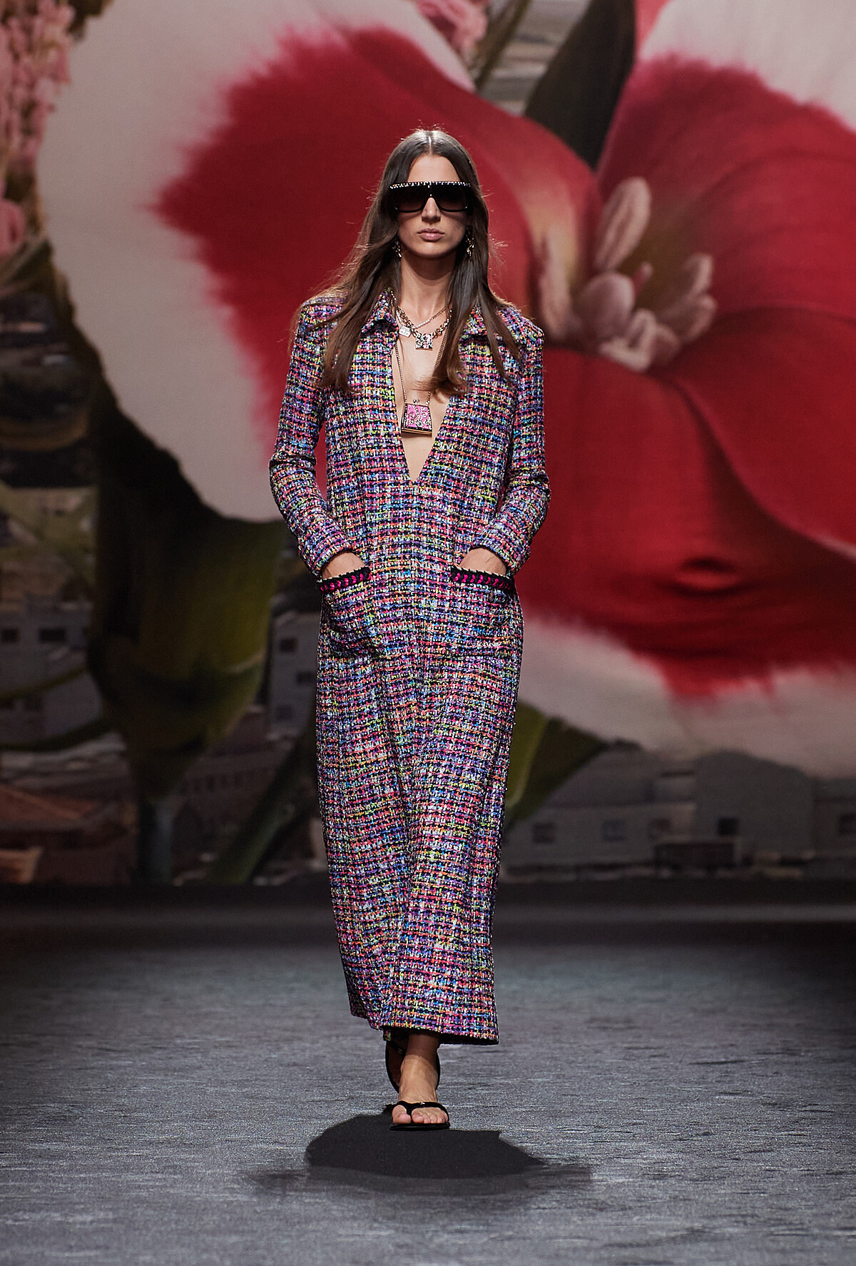 「同時呈現精緻度與休閒感,斜紋軟呢貫穿整個系列,運動服飾和蕾絲設計:我試著將衝突性的元素以最巧妙的方式組合在一起;而諾瓦耶別墅花園和泳池便是絕佳的環境背景,和系列概念相輔相成。」Virginie Viard說道,衝突性一向是時尚的有趣與不變之處,像是:泳裝、烏干紗澎裙、運動服飾和晚禮服這些各自不同的風格都在系列中展現,在精緻與休閒間取得完美比例。