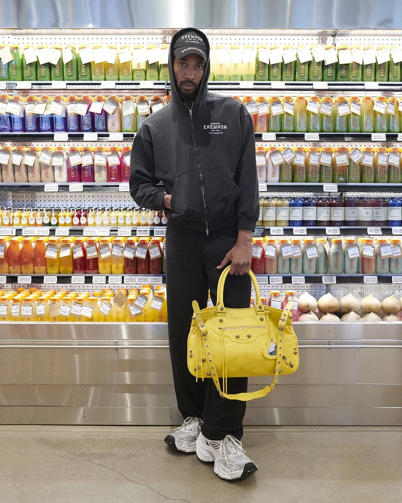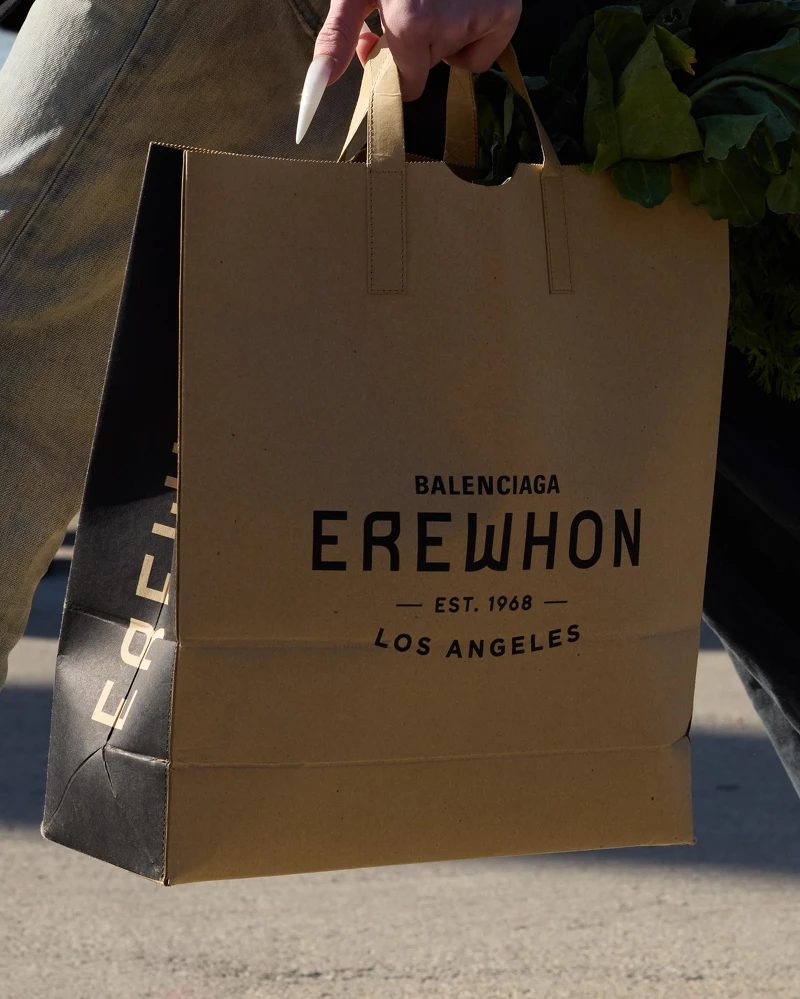 既然來到了洛杉磯,Demna找上了當地在社群上最紅的超市Erewhon合作!Erewhon是知名的高級健康超市,有超市界的愛馬仕稱號,他們家的現打果汁、果昔、蔬果牆特別有名,許多巨星都是常客,因此在年輕人們眼中Erewhon代表了一種高級品味。