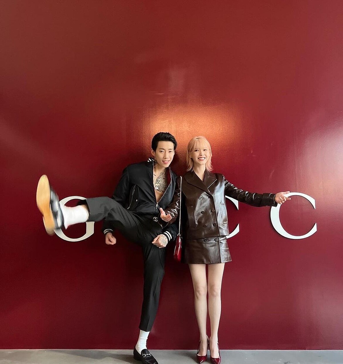 IU秀場上以棕色皮革套裝亮相,高跟鞋與身上的迷你1961賈姬包則是呼應Ancora標誌性的酒紅色,Jay Park一如既往絲毫不怕冷,選以一件棒球外套,大方露出胸肌與腹肌。