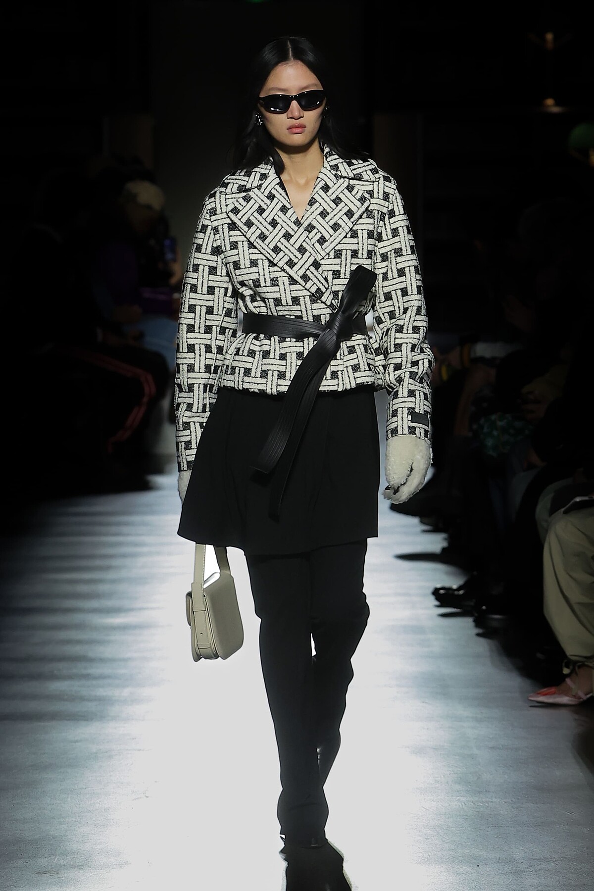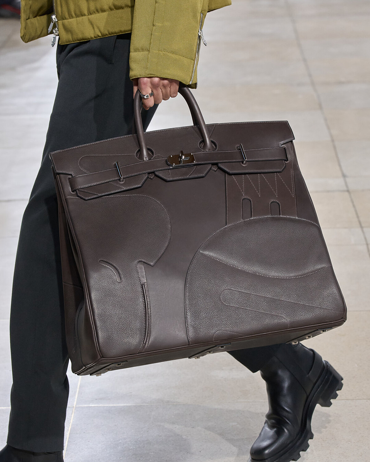 而在配件上,這款巨大尺寸的haut à courroies en selle手提包以切割成各式幾何形狀的小牛皮革,疊加縫製於包面上,製造出新鮮玩味的感受,是這回最受矚目的包款。