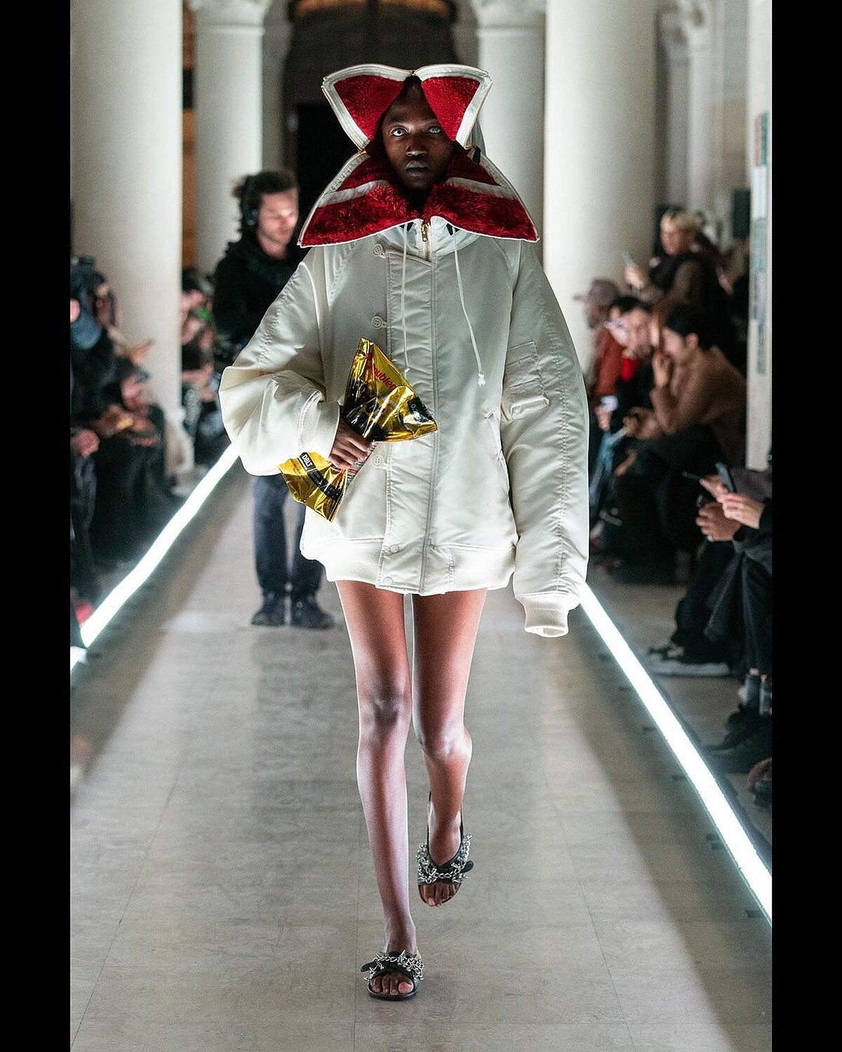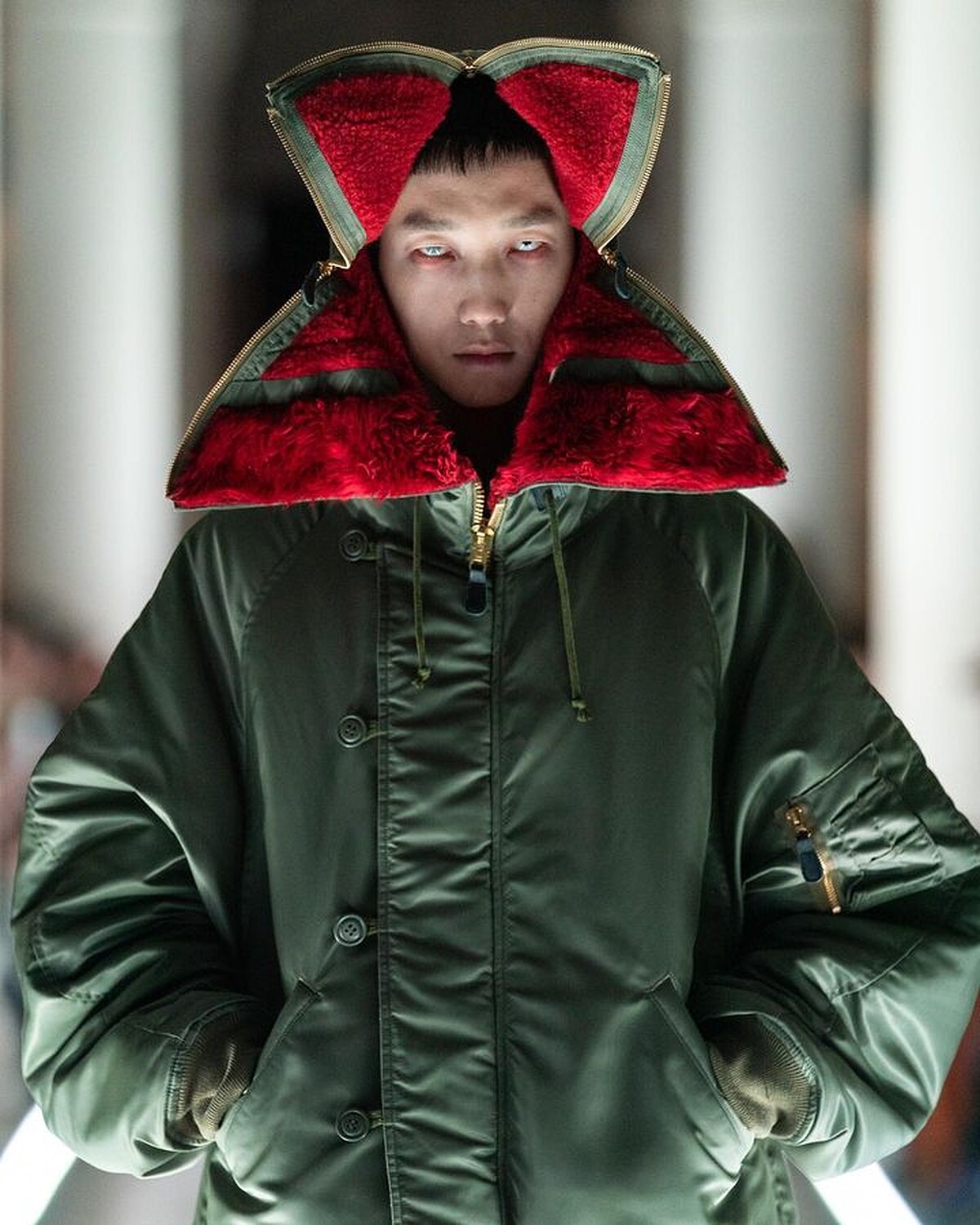 日本設計師品牌Doublet常帶來幽默惡搞的話題設計,2024秋冬系列以「The Cure」為主題,發表一系列有些怪誕邪氣的新裝,一件像是怪物張開血盆大口的飛行外套在網路上形成熱話,令人聯想到影集《怪奇物語》中的怪物Demogorgon,搭配上模特兒特殊的殭屍妝容,驚悚氛圍又給觀眾們帶來一次驚喜。