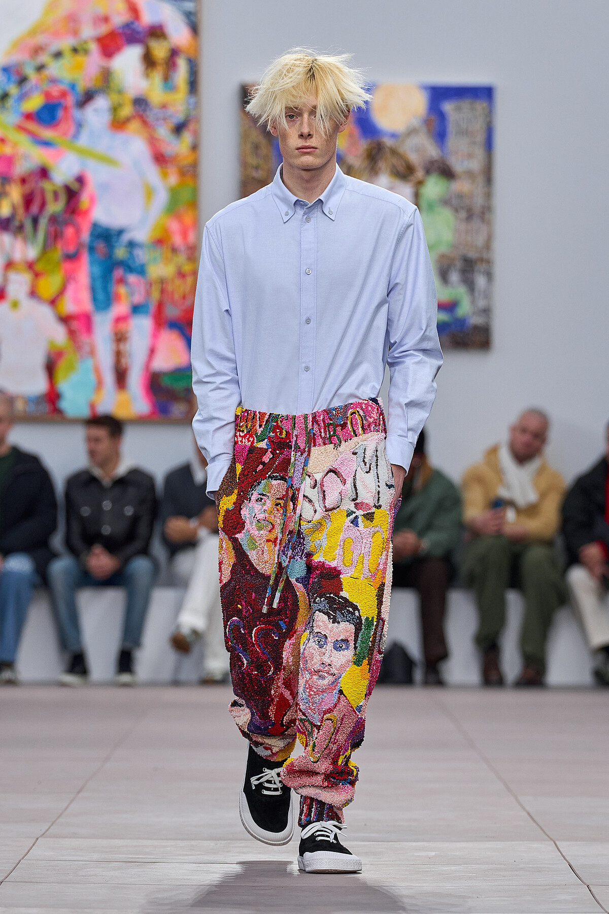 Loewe創意總監Jonathan Anderson攜手藝術家 Richard Hawkins(1961 年於德克薩斯州 Mexia 出生)打造Loewe 2024秋冬男裝系列,Richard Hawkins最經典的創作,是將新聞、網路上的名人照片重組拼貼而成,這和Jonathan Anderson這次想表達網路世界裡「男性氣質的演算法」理念相扣。秀場宛如一座白色教堂,但牆壁上的不是彩繪玻璃,而是Richard Hawkins以Loewe各品牌大使為主角製作的拼貼作品。