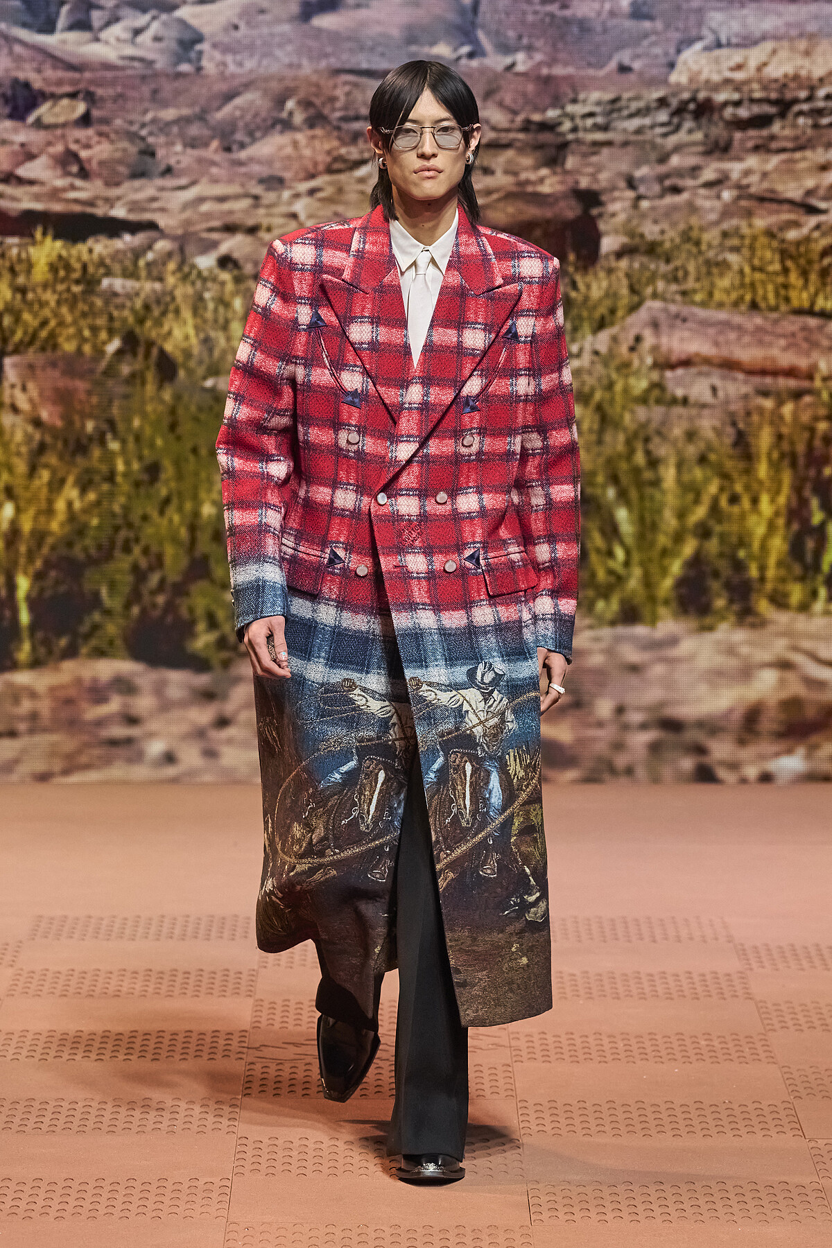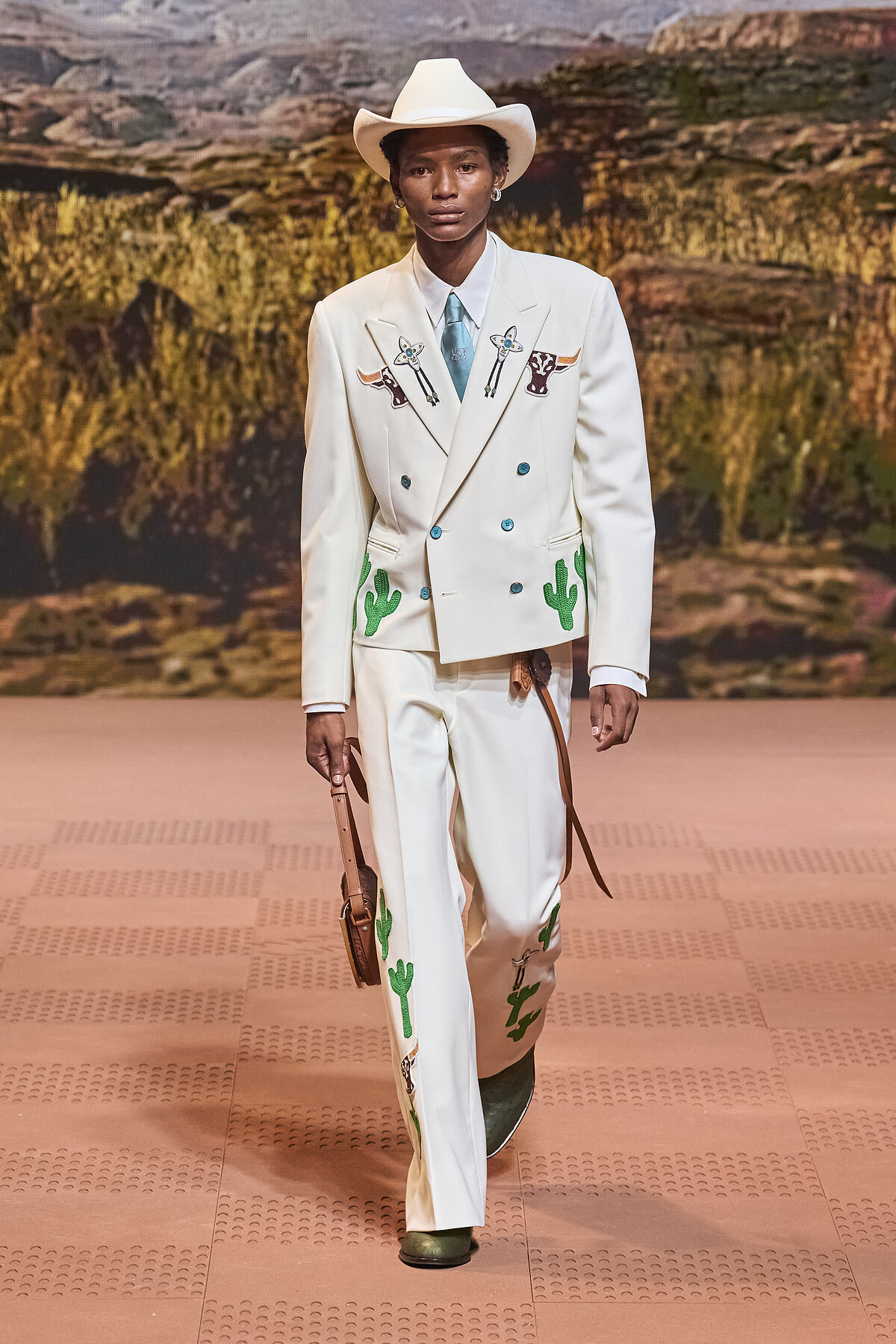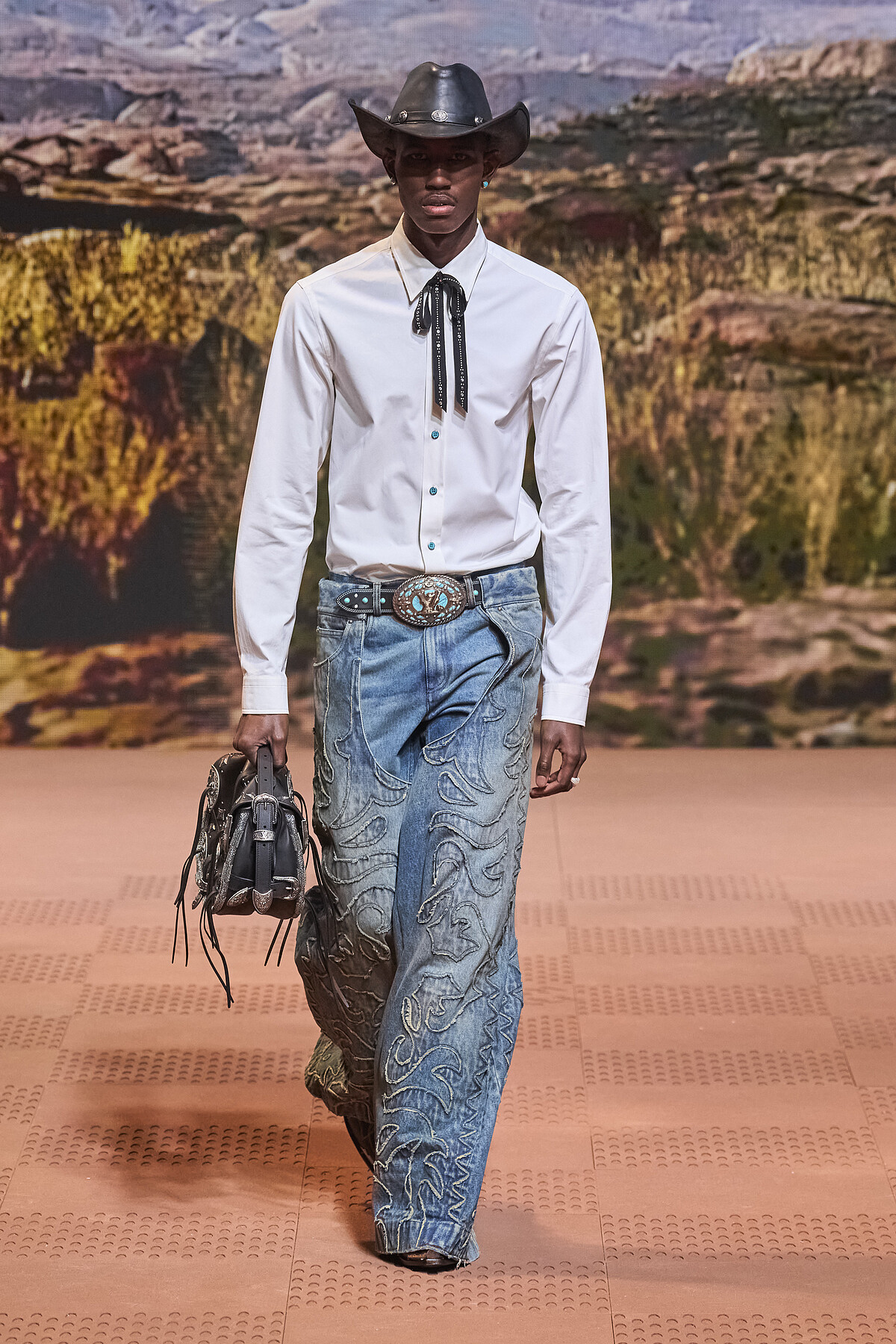 Louis Vuitton 2024秋冬男裝大秀秀場一片沙色大地與荒野背景,很明顯的,男裝總監菲董Pharrell Williams將視角拉到他的故鄉美國維吉尼亞州,透過本季服裝描寫了一部美國西部牛仔的故事。2024秋冬Pharrell Williams回溯美國西部服裝的根源,因此能看到本季造型以工作服為基礎輪廓,以及各式西部代表性的服裝與巴黎時裝屋的華麗工藝相結合,秀上處處充滿流蘇、丹寧面料、雕花設計、金屬等元素,和西部自然景觀的圖像。