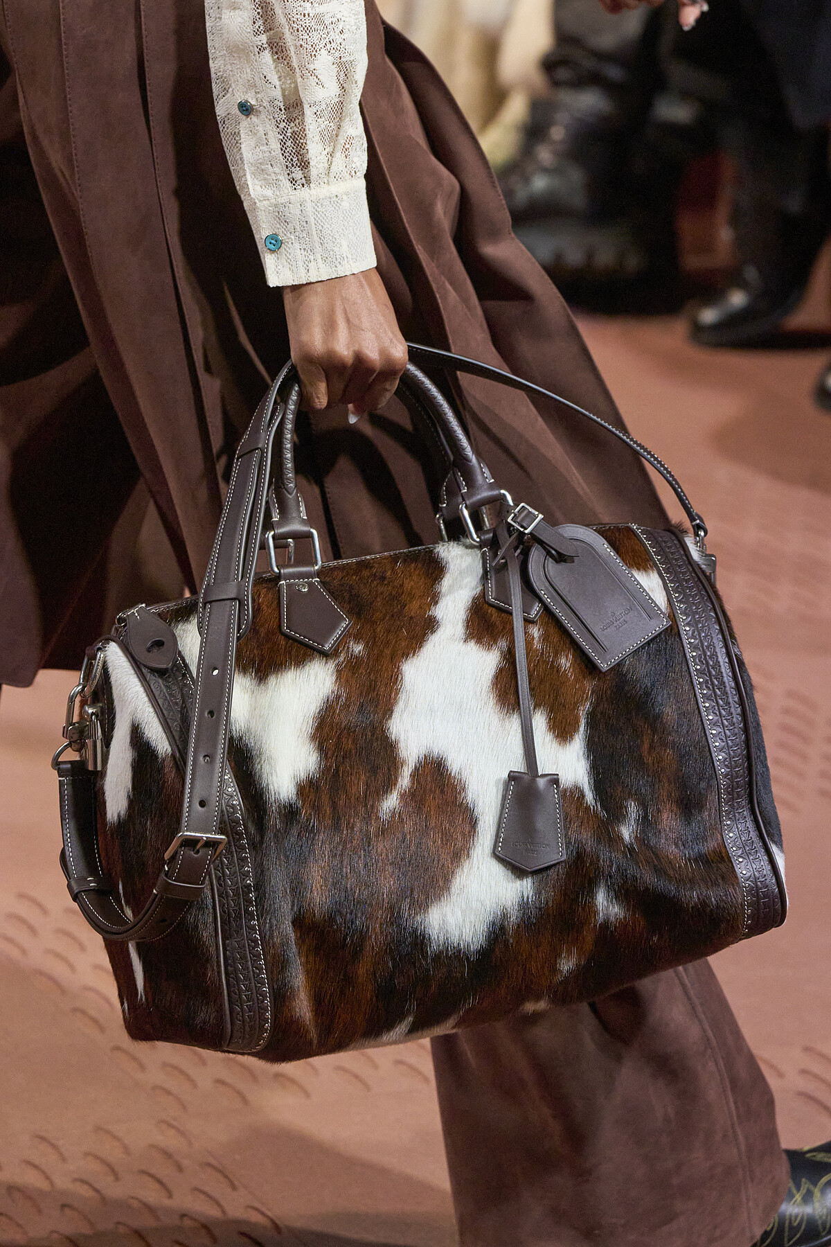 關於Louis Vuitton 2024秋冬男裝系列的焦點配件,則不能忘記在發表前便已引起話題的Timberland聯名鞋款,是最能詮釋美國風格的一款工作靴。不只有上一季火紅的Speedy手袋延伸出更多顏色與面料,以旅行洗衣袋為靈感製造的Steamer 手袋,則在本季以3種尺寸回歸,其中最大尺寸包款最吸睛又十分具有份量。此外,值得一看的是,秀上模特以推車展示的收藏硬箱組合,想必也將成為全球各地藏家的下個目標。