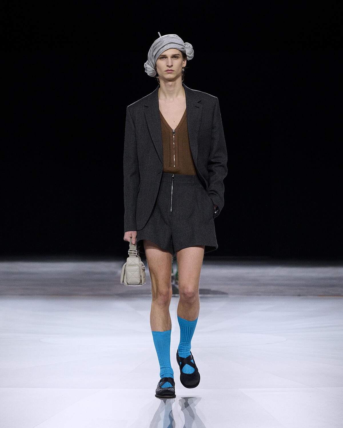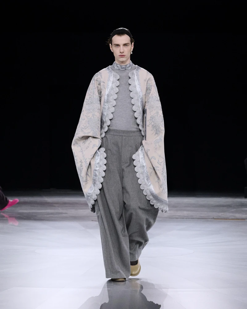 這回Kim Jones的設計其實相當挑戰男性穿著者的個人駕馭力,重申Saint Laurent聖羅蘭先生的裁縫工藝,迪奧先生的Bar Jacket則換上全新陽剛輪廓,與Kim Jones設計的Oblique緹花結合,而中央拉鍊的羊毛連身褲裝、貼身的服裝,則呼應Rudolf Nureyev的真實舞者風格,像是一款銀色和服罩衫,正源自Rudolf Nureyev曾穿過的造型,需耗費10名工匠共三個月時間才能完成。