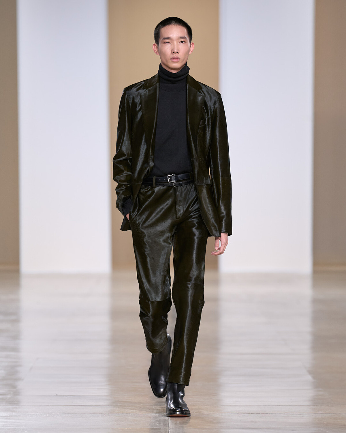 在精品逐漸潮流化的今日,愛馬仕總是秉持一如既往的紳士品格,不斷將男士正裝精進,並在端莊的輪廓下加入新奇巧思。本季的橡膠大衣、威爾斯格紋風衣、人字紋大衣、精緻內襯,都是疊搭出Dandy風格的重點單品,在正式與休閒之間的精準拿捏,從日常到戶外皆能派上用場,且諸多品項多了兩面穿的多功能性,此外,2024秋冬男裝其中一套Look裡模特兒所演繹的馬毛光澤套裝,特別吸引編輯目光。