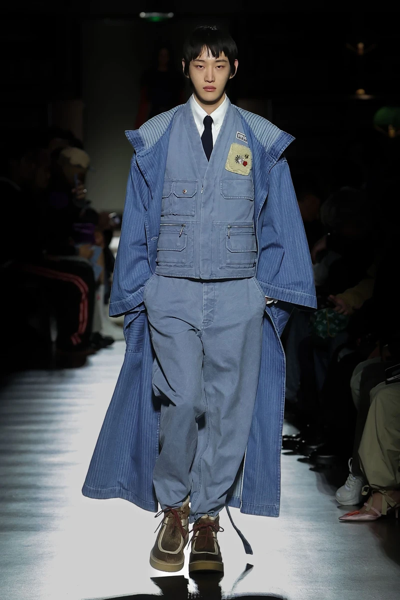 Kenzo藝術總監Nigo認為將非西方元素融入巴黎時尚領域,是創辦人高田賢三先生一向的設計願景,因此在本季使用了諸多日本傳統細節,像是和服外套、消防員夾克木版印刷、十五世紀江戶紋樣…與工裝造型、飛行外套等西方服裝搭配組合。