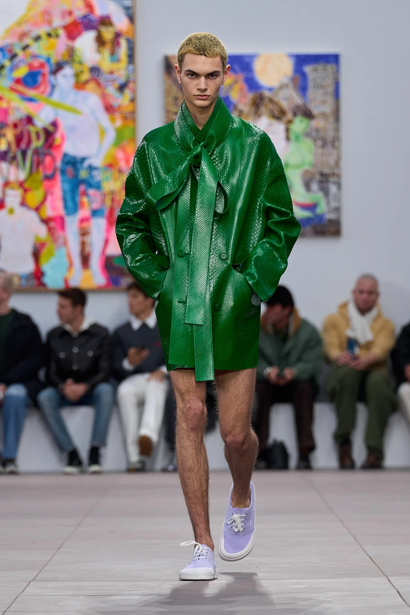 Loewe與Richard Hawkins的合作亦延伸到服裝上,在毛絨材質下把作品運用於帽T、褲裝、大衣或是包款上。Jonathan Anderson一向不走正常路線,透過非典型的男裝設計再次吸引我們的目光,像是缺乏下身的造型、不知實際上是否有用處的皮帶、看起來像是隨便亂搭的不和諧Look……看來都將為他賺取一波流量。