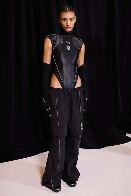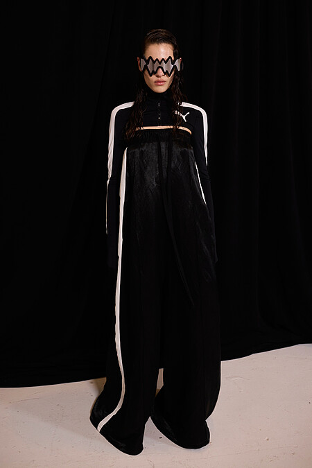 Mostro,其實是義大利文「怪物」之意,也是Puma 1999年就推出的一款球鞋:不規則的輪廓,加上刺蝟一般的鉚釘設計,即使以現代視角來看,仍頗有其怪誕氣質。以Mostro球鞋貫穿全場56套造型,服裝方面Puma以強烈的街頭元素和版型為主軸,前衛又極有個性。