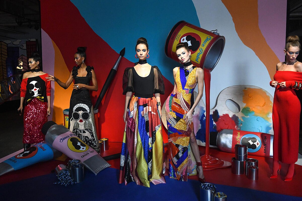 有點俏皮又有點可愛公主的Alice & Olivia,2024秋冬系列帶你一次跨越多個年代的藝術風格:從60年代的普普藝術(pop art)、70年代的抽象壁畫、80年代的塗鴉風潮,到90年代流行的肖像照,轉化為冶艷的紅唇色套裝、浪漫又甜美的蝴蝶結禮服、典雅的軟呢西外、如disco ball 一般璀璨珠飾⋯⋯刻畫出Stacey的百變造型。