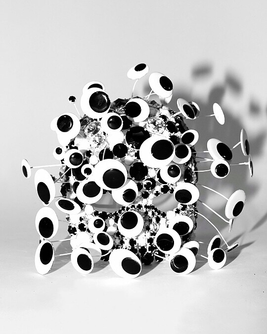 向來大膽前衛的Area,這一次以《看與被看》為題,用了兒時美術課會用到的「動動眼」作為重點元素,打造出一系列的成衣與訂製服。最初的靈感來自眼睛檢查(也是滿突然的?),不過卻讓編輯聯想到現代的我們因為手機的鏡頭,時常透過我們的鏡頭看(拍)別人,也被別人的鏡頭記錄著。