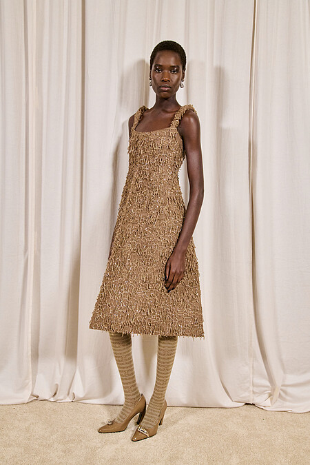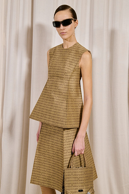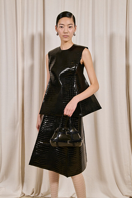 Tory Burch延續上一季的「實驗精神」,2024秋冬繼續嘗試品牌過往比較少見的廓形與材質,而本回的主軸從家居品出發,例如在裙裝和西外,版型是移植了燈罩的形狀,銳利的邊角應用在皮革、軟呢等軟硬不一的面料上,呈現出不一樣的立體感。