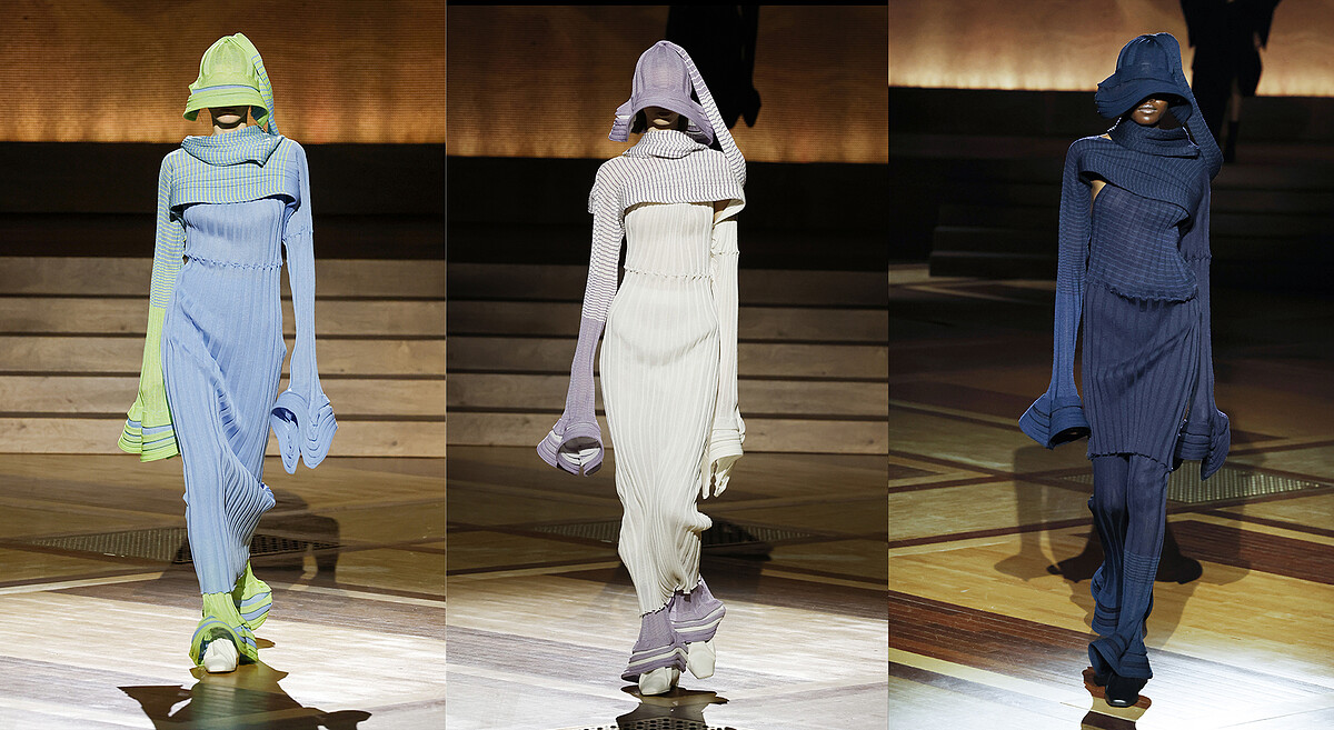 管狀造型輪廓外觀讓ASAGAO 系列和本意是日文牽牛花的讀音完美呼應,整體服裝造型由管狀輪廓無縫編織而成,在袖口、裙擺、帽子以外擴線條呈現出牽牛花姿態,清新沉靜柔和的質感色調將花朵獨有的纖細透明感詮釋的恰如其分。