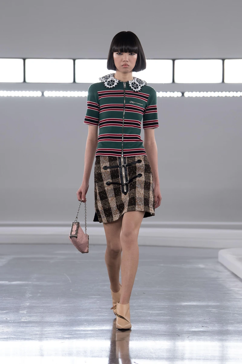 Louis Vuitton 2024早秋女裝系列服裝長短錯落,有線條俐的落緞光短裙、不對稱的斜裁裙襬,宮廷袖、蕾絲領片等古典元素配上更為現代、甜美的輪廓,跳色的印花製造反差感,亦有度假風情的飄逸洋裝,此外,系列中仍加入了數套典雅晚裝,帶來花苞裙剪裁的禮服,搭配運動風綁帶高跟鞋營造衝突感。
