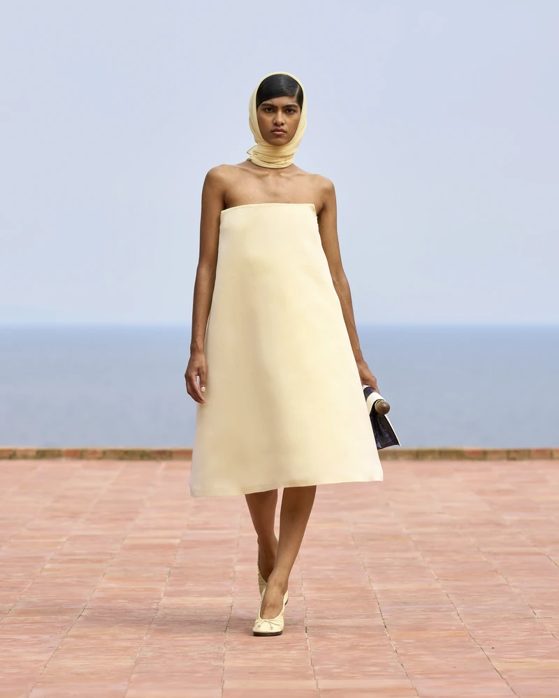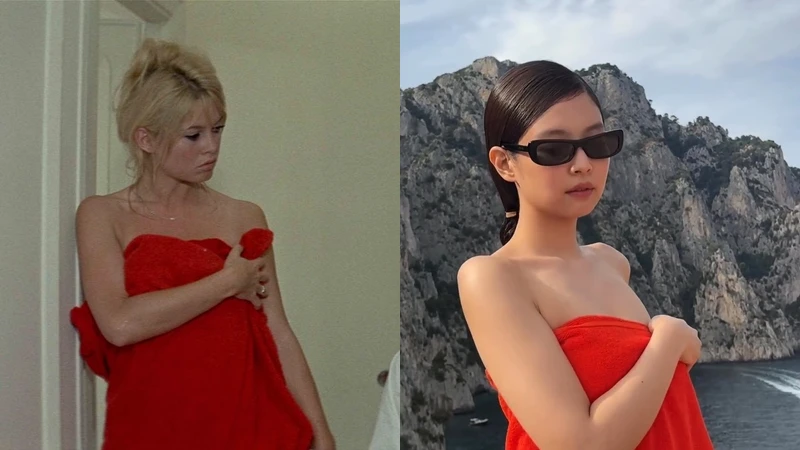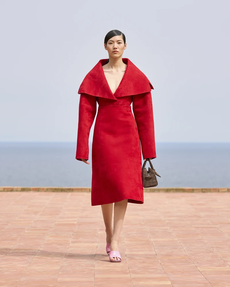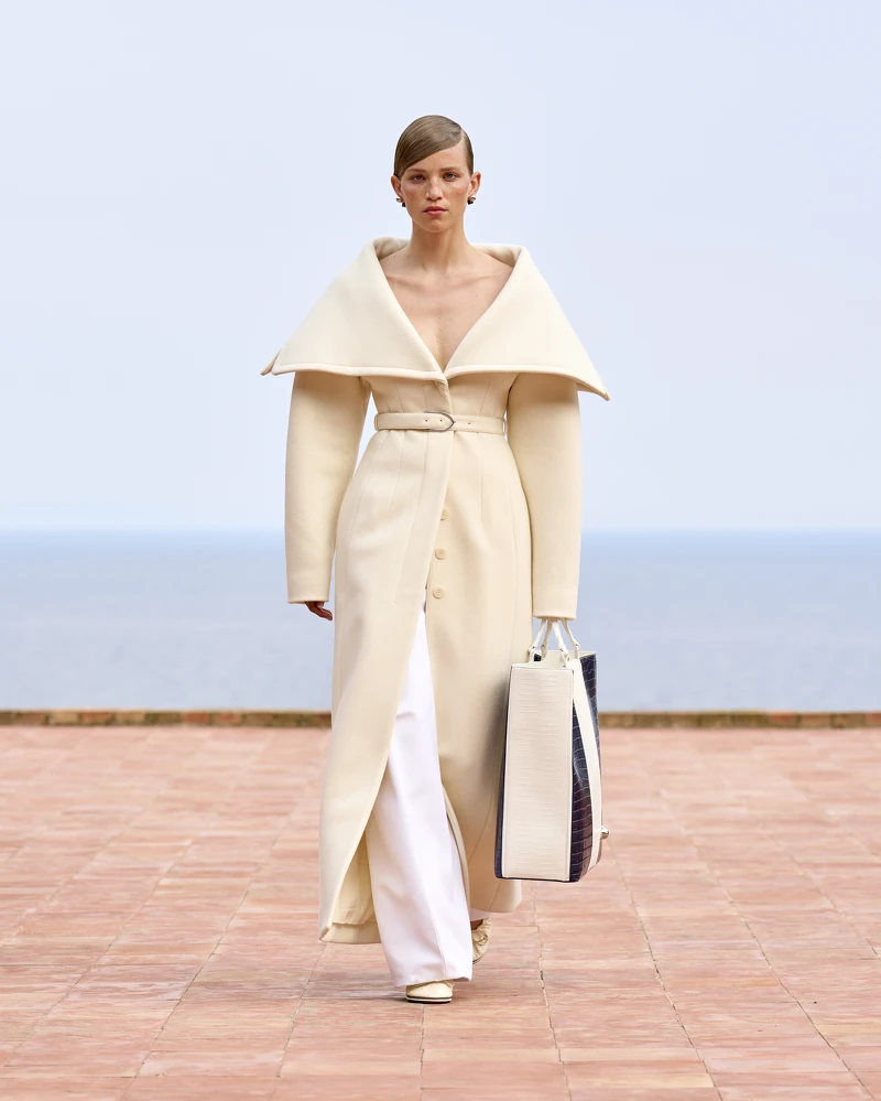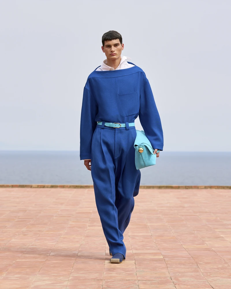 Jennie在預告中披的紅色浴巾、開場Look的黃色浴袍外套,延伸自電影經典場景,Jacquemus 2024 秋冬使用的色調像是為了這個海邊量身打造,清新檸檬黃與蔚藍的海水顏色,佐上一抹熾熱的紅,在Simon Porte Jacquemus玩轉幾何形狀的剪裁下,帶來巨大領片的水手風格大衣、立體荷葉邊衣裝、高腰修飾的男士褲裝,動物紋則精準點綴了各種造型,本季墨鏡與頭巾搭配、以及延續先前的雙層跟鞋款式,是值得注意的焦點配件。