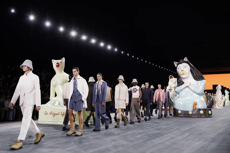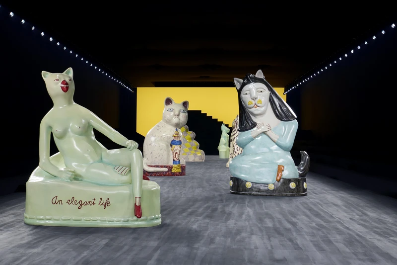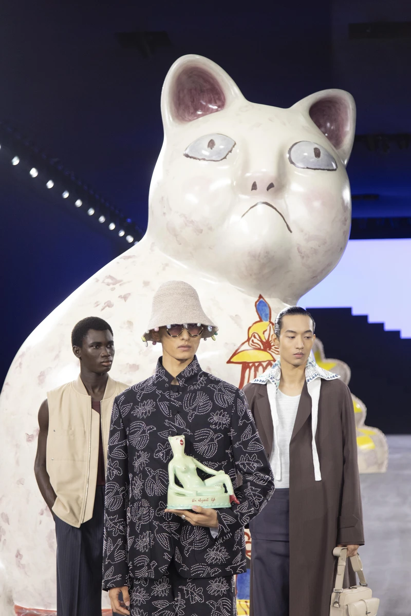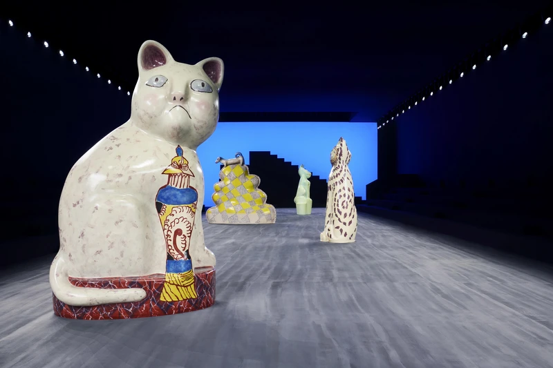 秀場設計也融入了南非陶藝家 Hylton Nel 為靈感的貓咪雕塑主題,巨大的貓咪雕塑造型佇立在秀場。