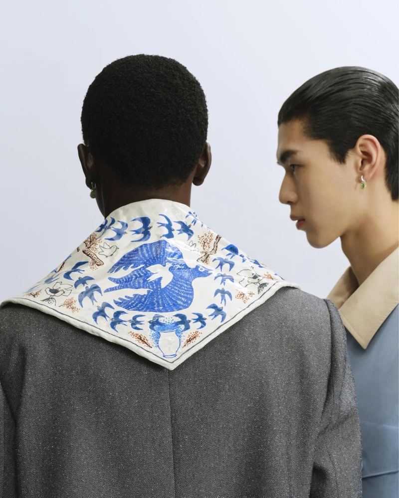 將目光拉回秀上造型,在此次系列中,Kim Jones 從六○年代經典的「Negatif」圍巾領汲取靈感,並透過仿陶瓷結構、輪廓以及玩味圖案、印花與陶瓷扣飾,將藝術家 Hylton Nel 的風格融入,將經典與藝術帶到現代。